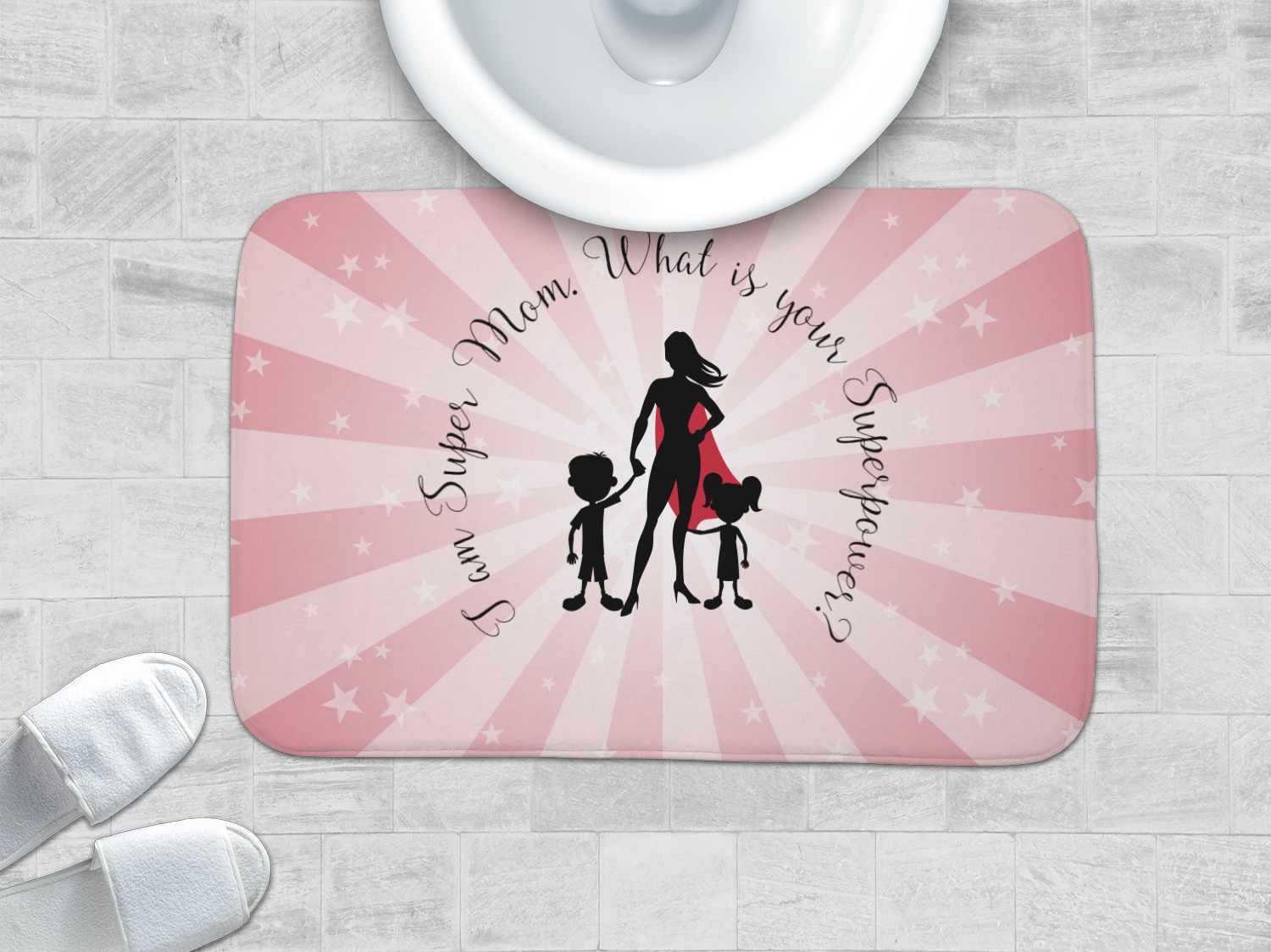 Our Super Mom design is perfect for your Mother's Day Gift. Moms today are truly super heroes with all that they have to balance. Our adorable design depicts a super hero mom / woman holding hands with a little boy and a little girl. Our super hero mom is wearing a red cape. We used a blush colored starburst with stars to highlight our beautiful mother. We personalized with our new circular text and used the words "I am a Super Mom. What is your Superpower?". We use a scripty girly font. We think the design looks outstanding!
