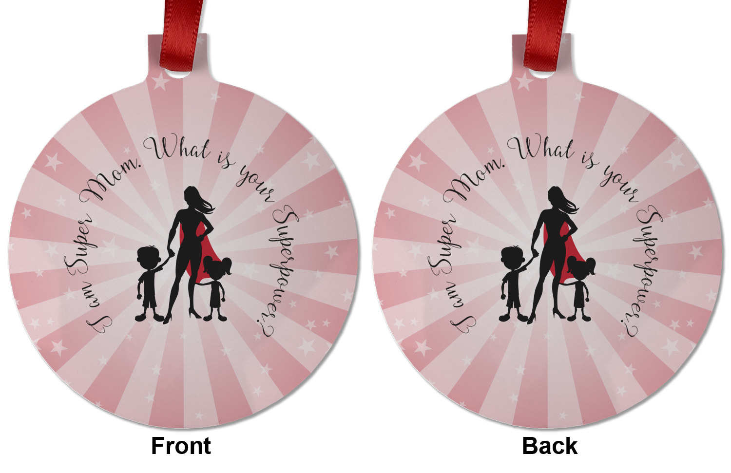Our Super Mom design is perfect for your Mother's Day Gift. Moms today are truly super heroes with all that they have to balance. Our adorable design depicts a super hero mom / woman holding hands with a little boy and a little girl. Our super hero mom is wearing a red cape. We used a blush colored starburst with stars to highlight our beautiful mother. We personalized with our new circular text and used the words "I am a Super Mom. What is your Superpower?". We use a scripty girly font. We think the design looks outstanding!