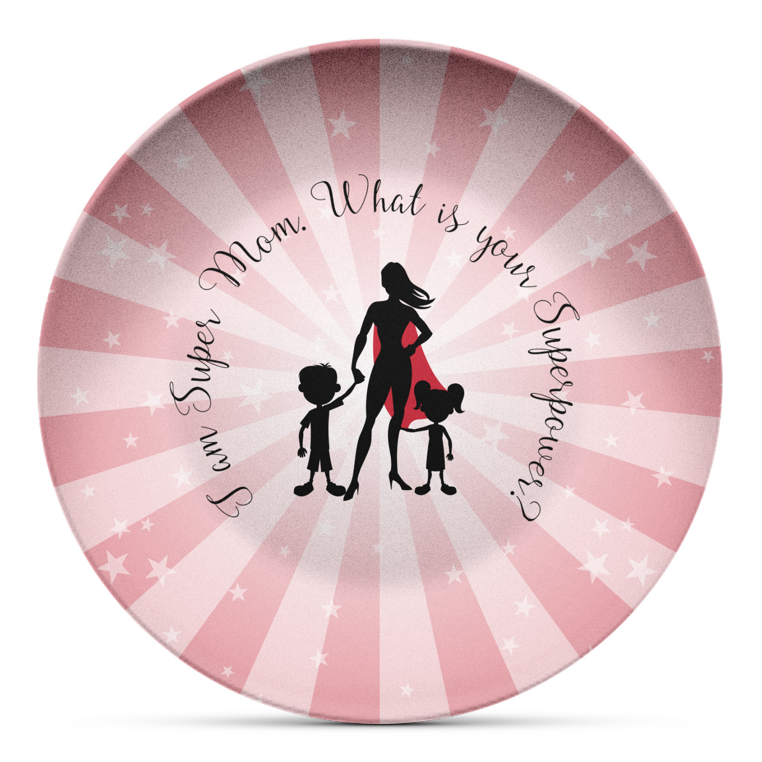 Our Super Mom design is perfect for your Mother's Day Gift. Moms today are truly super heroes with all that they have to balance. Our adorable design depicts a super hero mom / woman holding hands with a little boy and a little girl. Our super hero mom is wearing a red cape. We used a blush colored starburst with stars to highlight our beautiful mother. We personalized with our new circular text and used the words "I am a Super Mom. What is your Superpower?". We use a scripty girly font. We think the design looks outstanding!