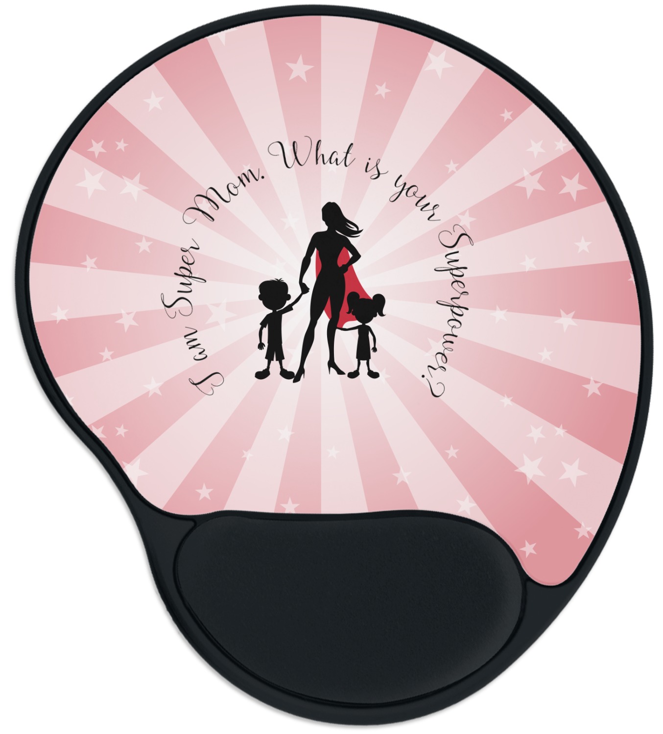 Our Super Mom design is perfect for your Mother's Day Gift. Moms today are truly super heroes with all that they have to balance. Our adorable design depicts a super hero mom / woman holding hands with a little boy and a little girl. Our super hero mom is wearing a red cape. We used a blush colored starburst with stars to highlight our beautiful mother. We personalized with our new circular text and used the words "I am a Super Mom. What is your Superpower?". We use a scripty girly font. We think the design looks outstanding!