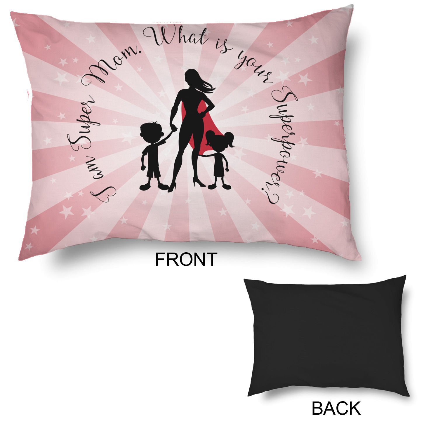Our Super Mom design is perfect for your Mother's Day Gift. Moms today are truly super heroes with all that they have to balance. Our adorable design depicts a super hero mom / woman holding hands with a little boy and a little girl. Our super hero mom is wearing a red cape. We used a blush colored starburst with stars to highlight our beautiful mother. We personalized with our new circular text and used the words "I am a Super Mom. What is your Superpower?". We use a scripty girly font. We think the design looks outstanding!