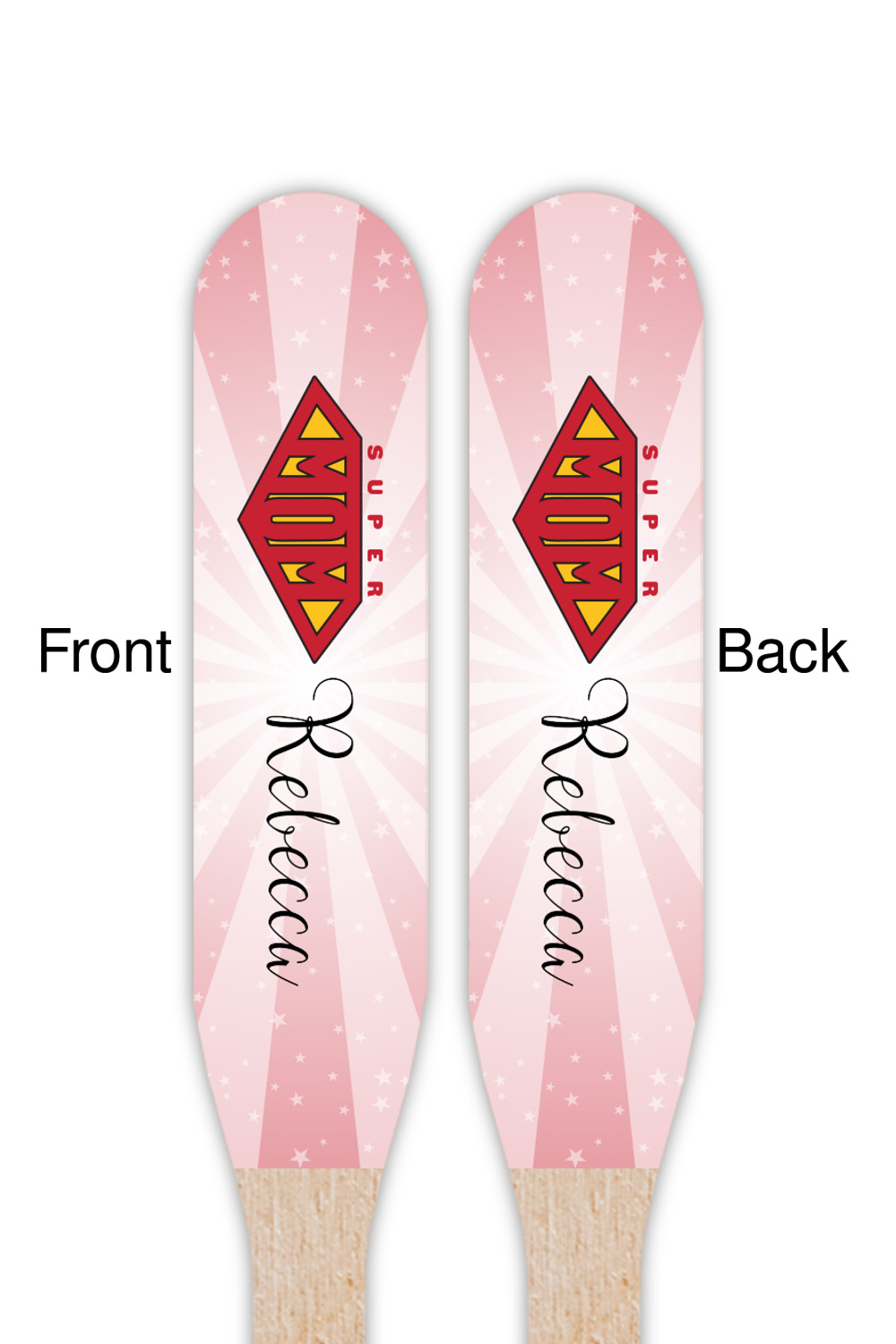 Our Super Mom design is perfect for your Mother's Day Gift. Moms today are truly super heroes with all that they have to balance. Our adorable design depicts a super hero mom / woman holding hands with a little boy and a little girl. Our super hero mom is wearing a red cape. We used a blush colored starburst with stars to highlight our beautiful mother. We personalized with our new circular text and used the words "I am a Super Mom. What is your Superpower?". We use a scripty girly font. We think the design looks outstanding!