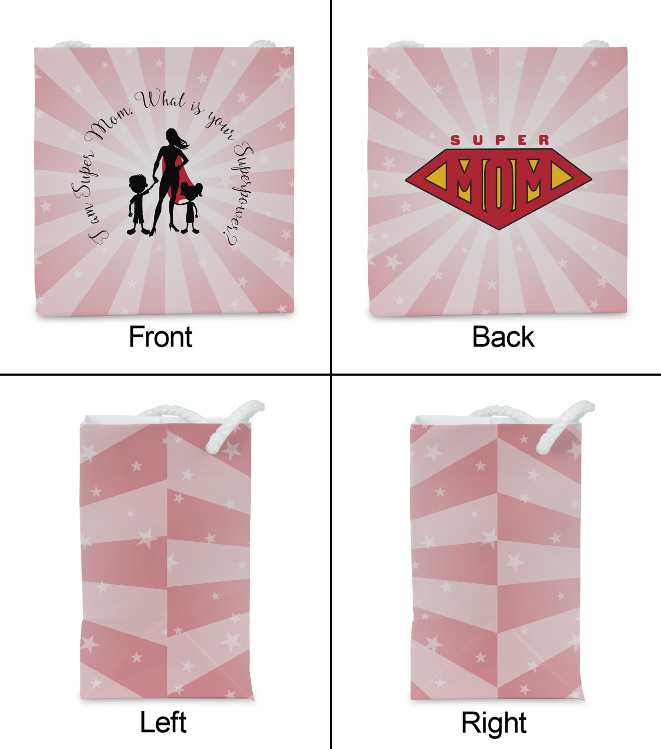 Our Super Mom design is perfect for your Mother's Day Gift. Moms today are truly super heroes with all that they have to balance. Our adorable design depicts a super hero mom / woman holding hands with a little boy and a little girl. Our super hero mom is wearing a red cape. We used a blush colored starburst with stars to highlight our beautiful mother. We personalized with our new circular text and used the words "I am a Super Mom. What is your Superpower?". We use a scripty girly font. We think the design looks outstanding!