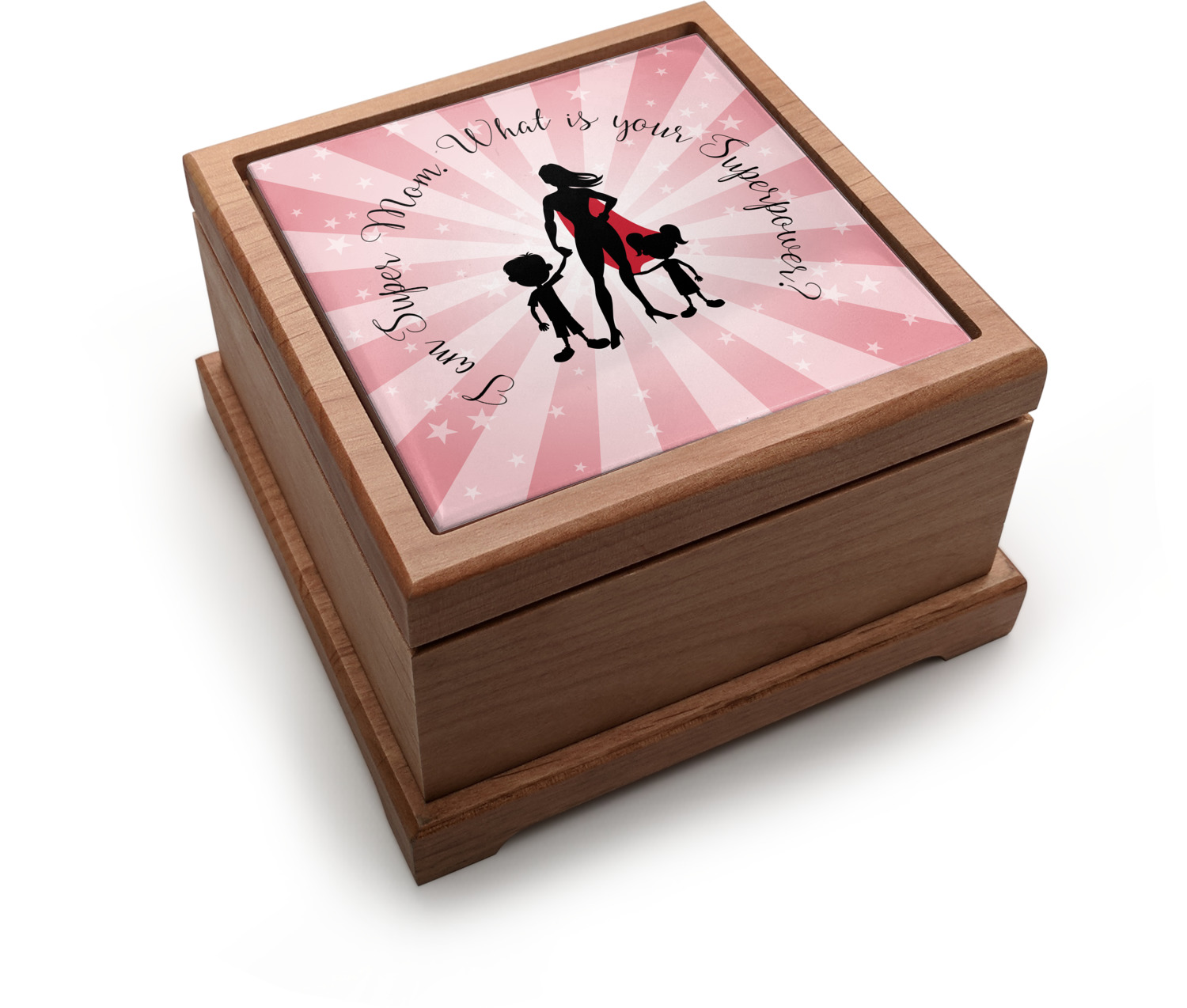 Our Super Mom design is perfect for your Mother's Day Gift. Moms today are truly super heroes with all that they have to balance. Our adorable design depicts a super hero mom / woman holding hands with a little boy and a little girl. Our super hero mom is wearing a red cape. We used a blush colored starburst with stars to highlight our beautiful mother. We personalized with our new circular text and used the words "I am a Super Mom. What is your Superpower?". We use a scripty girly font. We think the design looks outstanding!