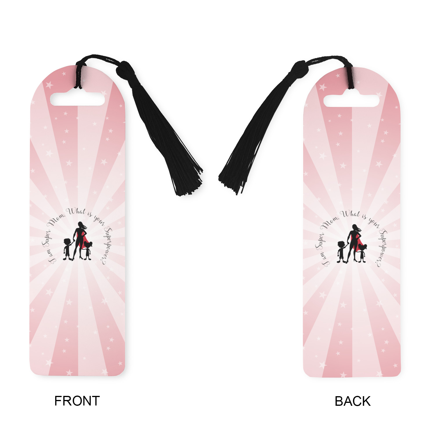 Made from a durable, flexible plastic, these bookmarks are printed with your custom design on them. With the tassel on them they make it easy to find your page in your book. These are a rectangular shape 7 1/4 inches tall with a rounded top and are approximately 2 1/4 inches wide.