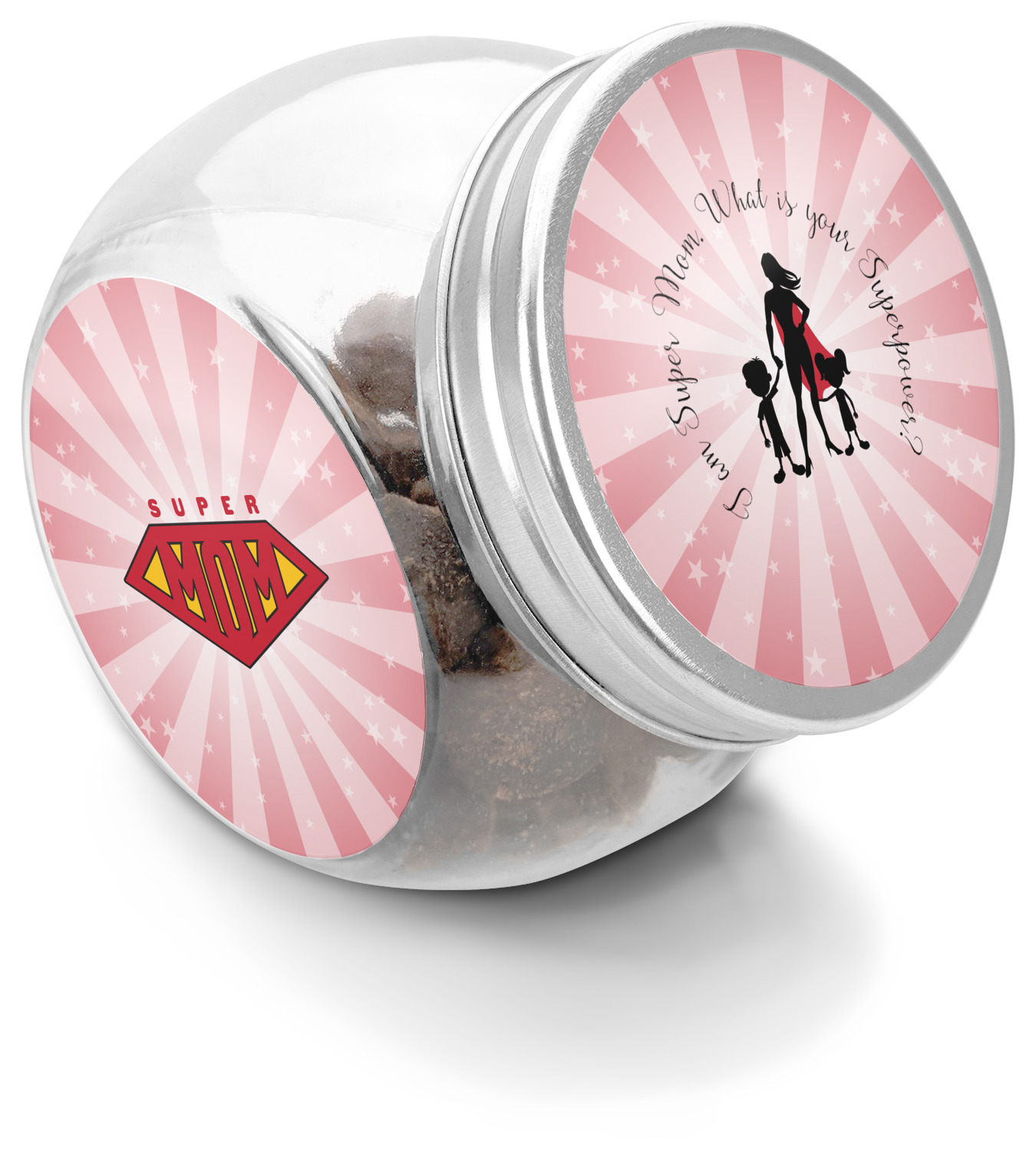 This treat jar is an excellent way to store treats for your favorite canine or feline. Moreover, their delicate, classy appearance makes them a tasteful addition to your countertop's décor. Crafted from clear glass, its unique construction and silver metal, screw-on lid allows for quick and easy access. Three, permanent, vinyl stickers are applied to both sides of the jar and lid, presenting your personalized design. The base of this glass, dog treat jar is 3.4" x 4.75", and the jar stands at 5" tall. Though on the smaller side, this jar is best suited for smaller treats or training treats.