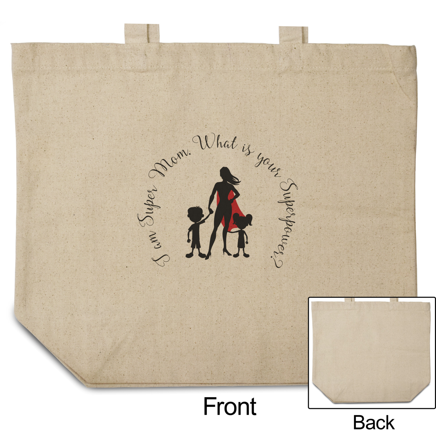 Our Super Mom design is perfect for your Mother's Day Gift. Moms today are truly super heroes with all that they have to balance. Our adorable design depicts a super hero mom / woman holding hands with a little boy and a little girl. Our super hero mom is wearing a red cape. We used a blush colored starburst with stars to highlight our beautiful mother. We personalized with our new circular text and used the words "I am a Super Mom. What is your Superpower?". We use a scripty girly font. We think the design looks outstanding!