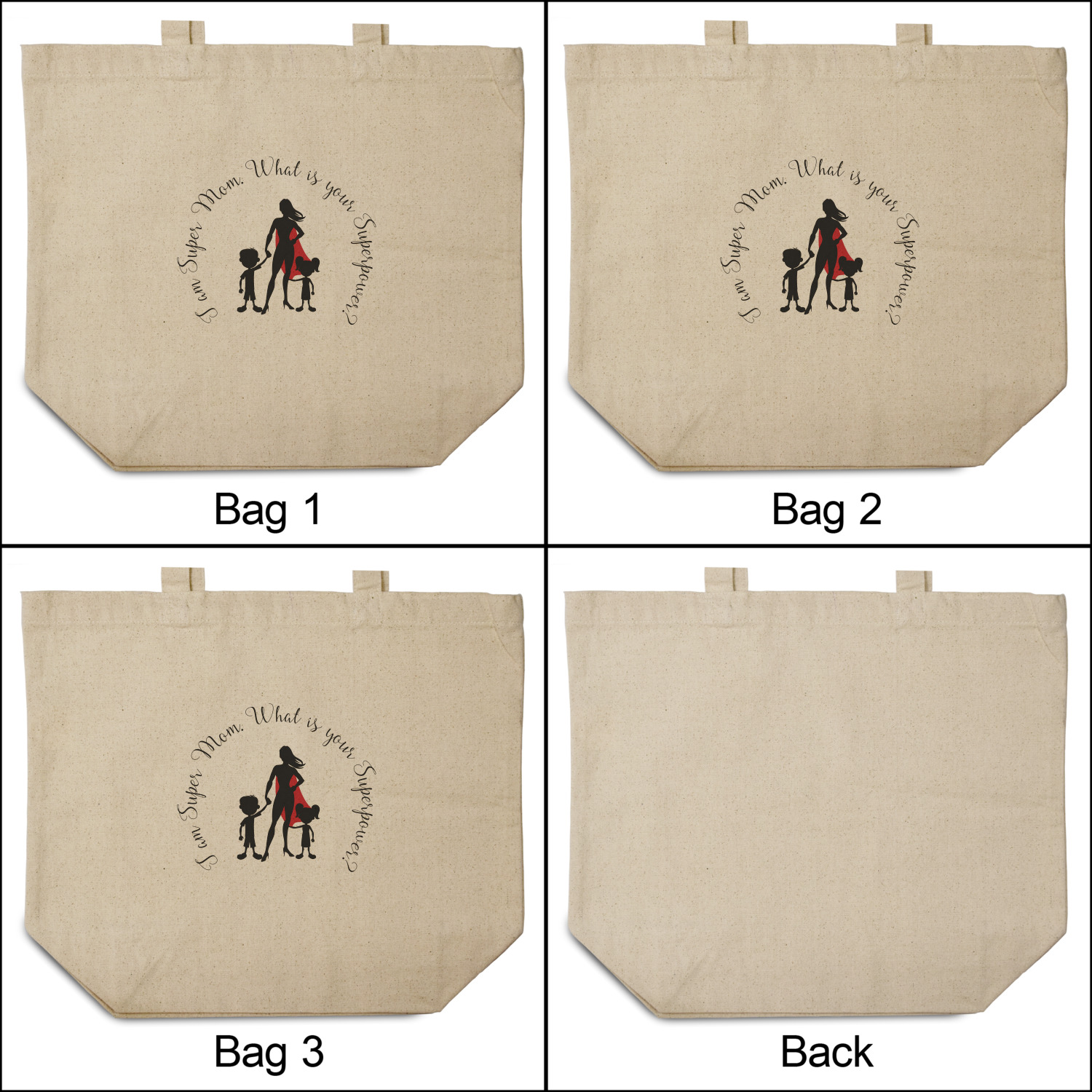 Our cotton totes are perfect for groceries, and can also be used to haul other stuff around as well. These totes are slightly larger than an average size tote - these cotton totes are 15" wide by 17" high, and have a 6" bottom gusset, which means they can hold more stuff and bulkier items.