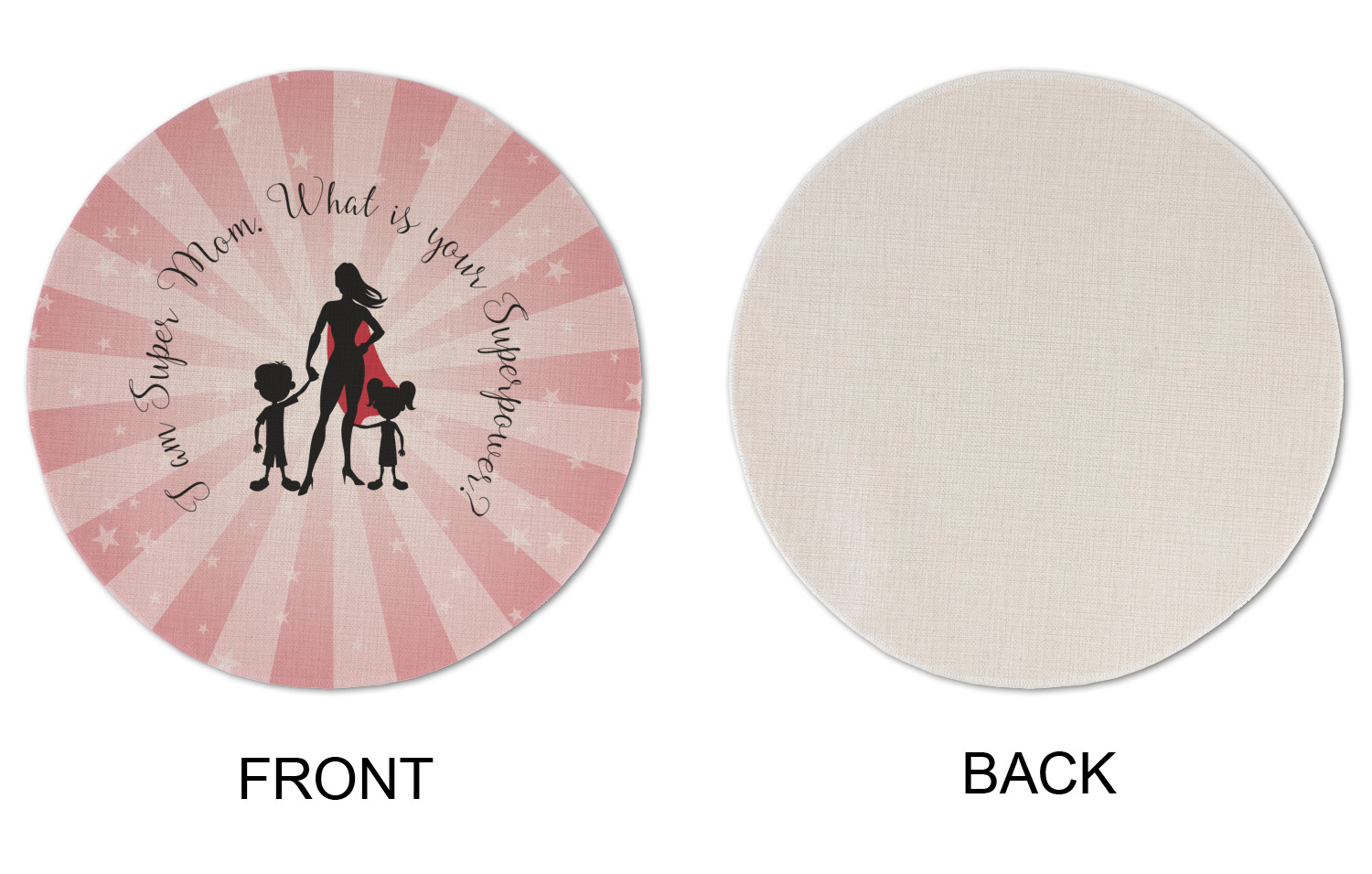 Our Super Mom design is perfect for your Mother's Day Gift. Moms today are truly super heroes with all that they have to balance. Our adorable design depicts a super hero mom / woman holding hands with a little boy and a little girl. Our super hero mom is wearing a red cape. We used a blush colored starburst with stars to highlight our beautiful mother. We personalized with our new circular text and used the words "I am a Super Mom. What is your Superpower?". We use a scripty girly font. We think the design looks outstanding!