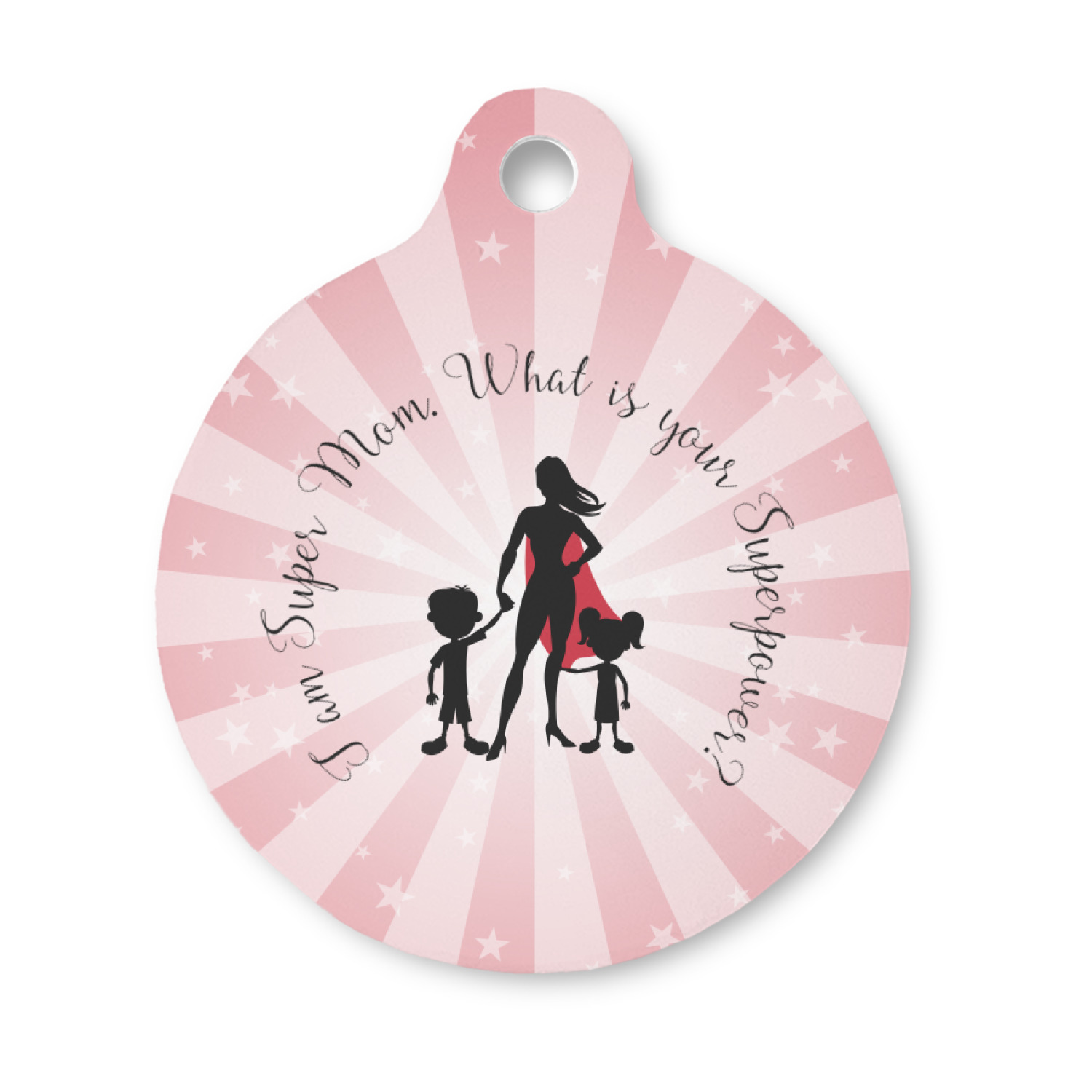 Our Super Mom design is perfect for your Mother's Day Gift. Moms today are truly super heroes with all that they have to balance. Our adorable design depicts a super hero mom / woman holding hands with a little boy and a little girl. Our super hero mom is wearing a red cape. We used a blush colored starburst with stars to highlight our beautiful mother. We personalized with our new circular text and used the words "I am a Super Mom. What is your Superpower?". We use a scripty girly font. We think the design looks outstanding!