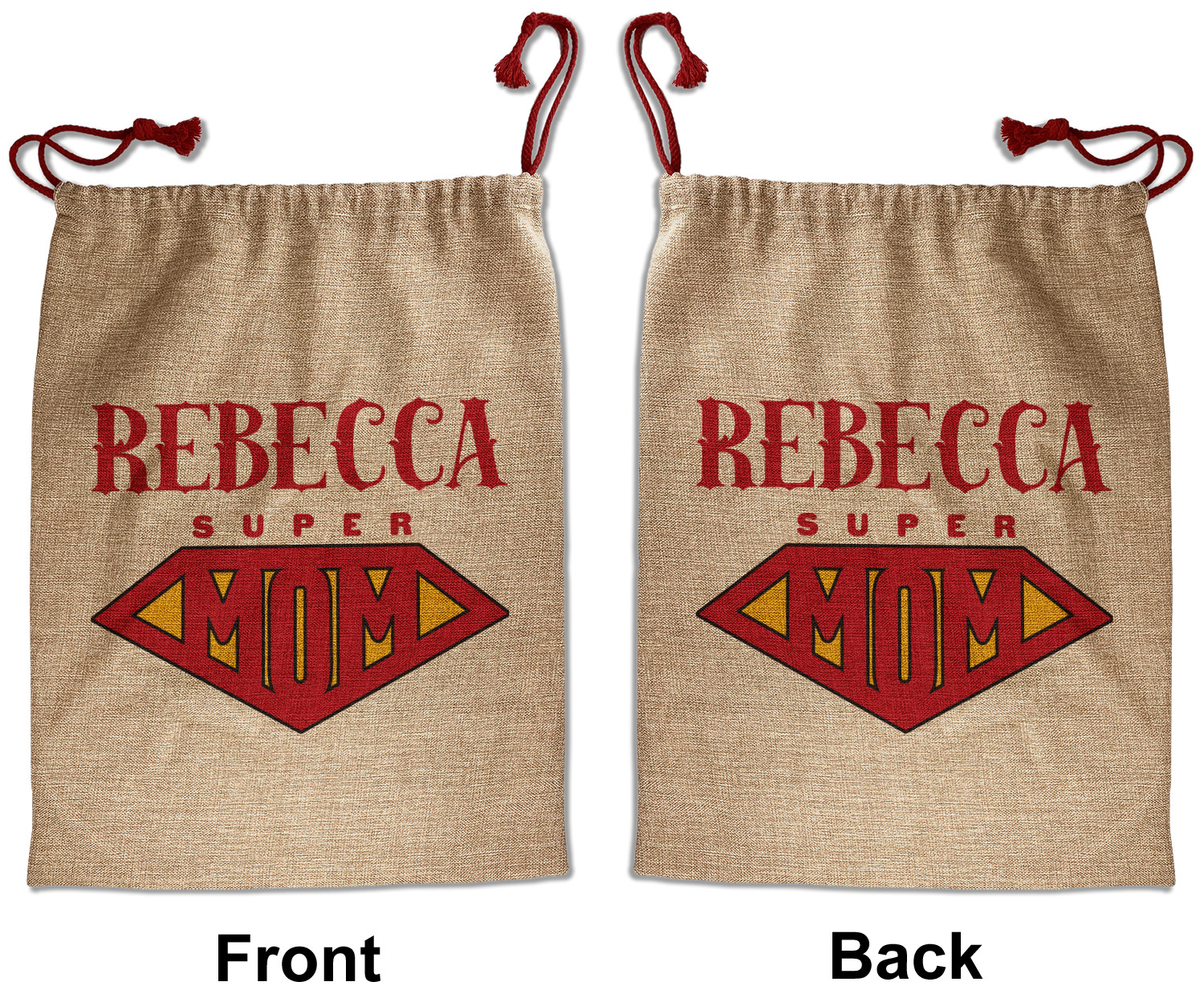 Our Santa sacks print your design on the burlap material giving it a nice rustic, natural design! The burlap material is also machine washable and wrinkle-free, so feel free to fold and store out Santa bags until the next time you need it! Secure your gifts with our red accent drawstring ties at the top of the sack so the mystery of your gift stays a surprise until Christmas day. We offer two types of printing- one side partial print or double-sided partial printing. Design and personalize your own Santa sack in time for the holidays!