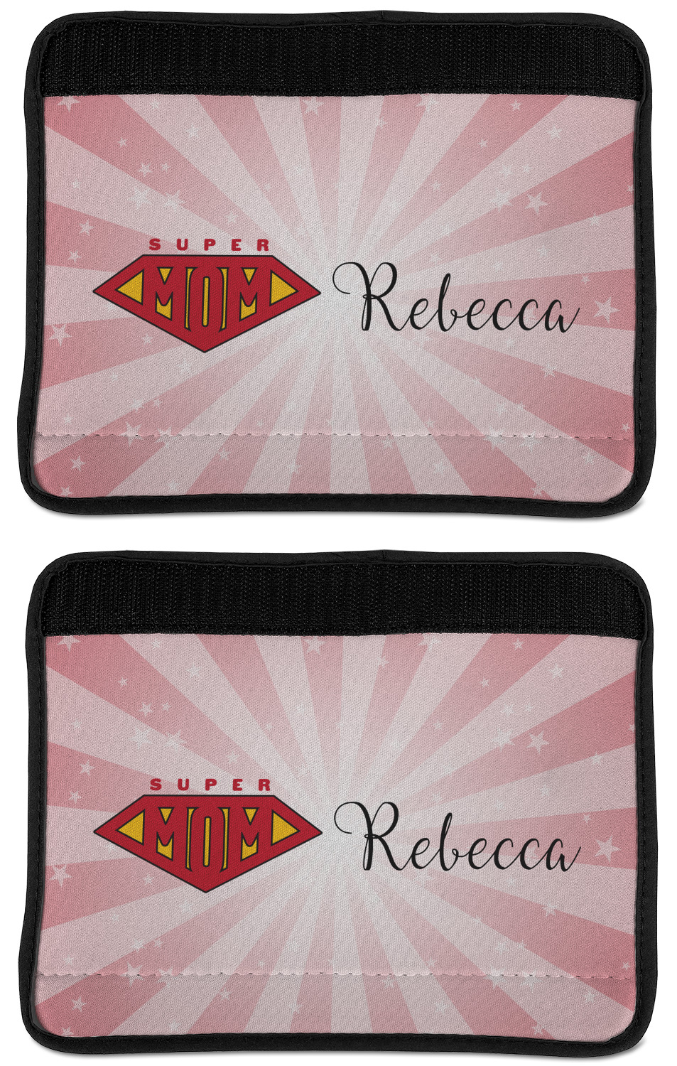 Made from neoprene, our seat belt strap covers wrap around the belt itself and have a Velcro tab for easy attachment and closure. The belt's edges are trimmed with a black polyester for a secure finish. Each cover is 9.5 by 7 inches when open and 9.5 by 2.5 inches when closed. We print your personalized design on the face of the seat belt pad.