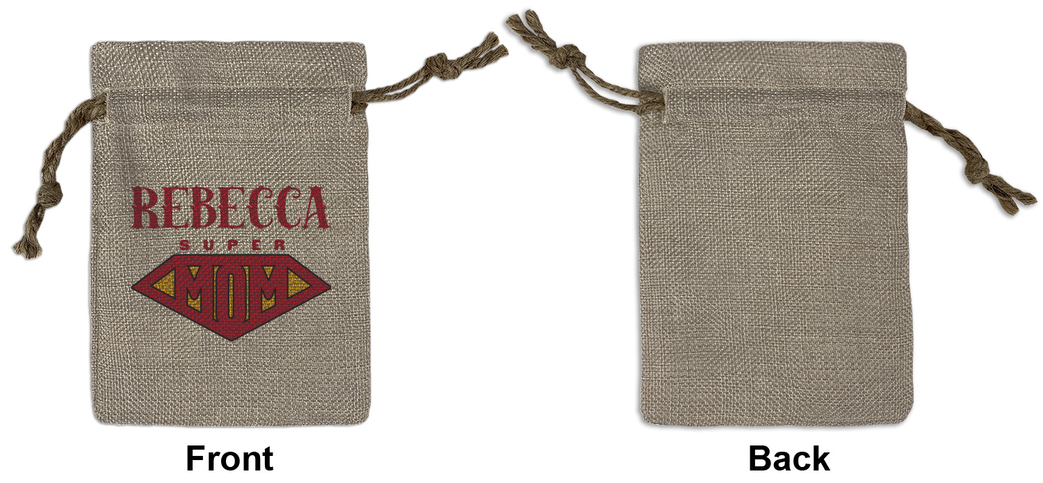 We sell our Burlap Gift Bags in 3 variant sized bags. Made with burlap polyester, each personalized bag can be secured with a twine drawstring pull. Your custom design is available to print on one side or both sides - completely up to you! The sizes of the bags measure approximately 4.5" x 6.5" for the smallest size, 6.5" x 8.0" for the medium size, and 6.5" x 13.5" for the large-sized bag.