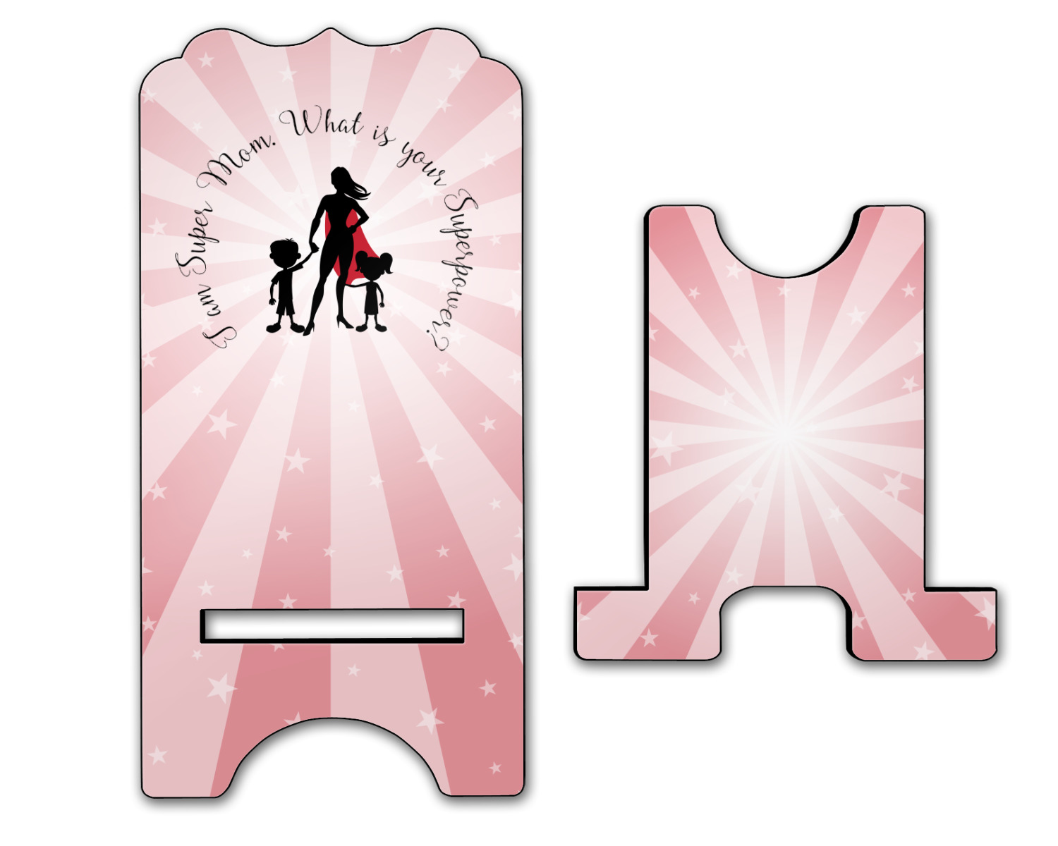 Our Super Mom design is perfect for your Mother's Day Gift. Moms today are truly super heroes with all that they have to balance. Our adorable design depicts a super hero mom / woman holding hands with a little boy and a little girl. Our super hero mom is wearing a red cape. We used a blush colored starburst with stars to highlight our beautiful mother. We personalized with our new circular text and used the words "I am a Super Mom. What is your Superpower?". We use a scripty girly font. We think the design looks outstanding!