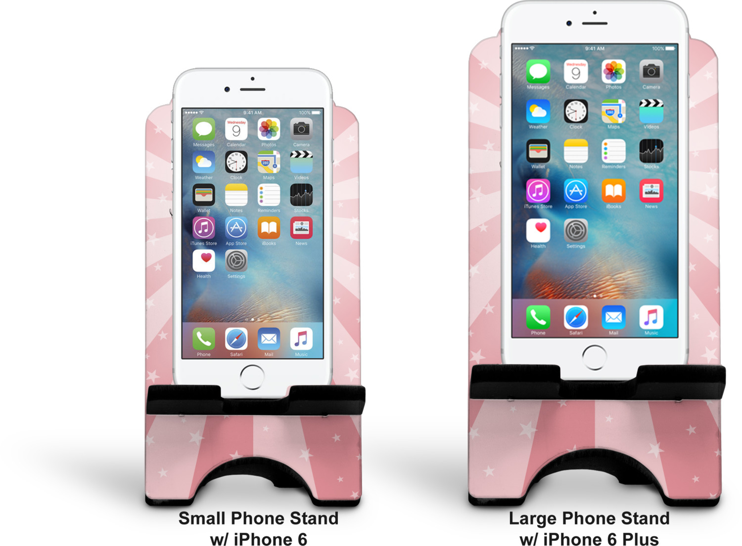 To meet your needs, we offer four variations of this IPhone stand. The backboard of the first version is shaped as a plain, yet sleek rectangle, and is available in two sizes. Our smaller size is approximately 4 by 3.25 by 7 inches, while the larger model is 4 by 3.77 by 8.5 inches. Alongside this model, we also provide you with a more decorative option. The upper part of our second version features a curved edge, for a classy, suave appearance. This phone holder is also sold in two sizes: a smaller version, which is 4 by 3.25 by 7 inches, and our larger model, which is 4 by 3.77 by 8.5 inches. Both models will support large phones, but the larger model is better if you wish to proudly display your personalized design.