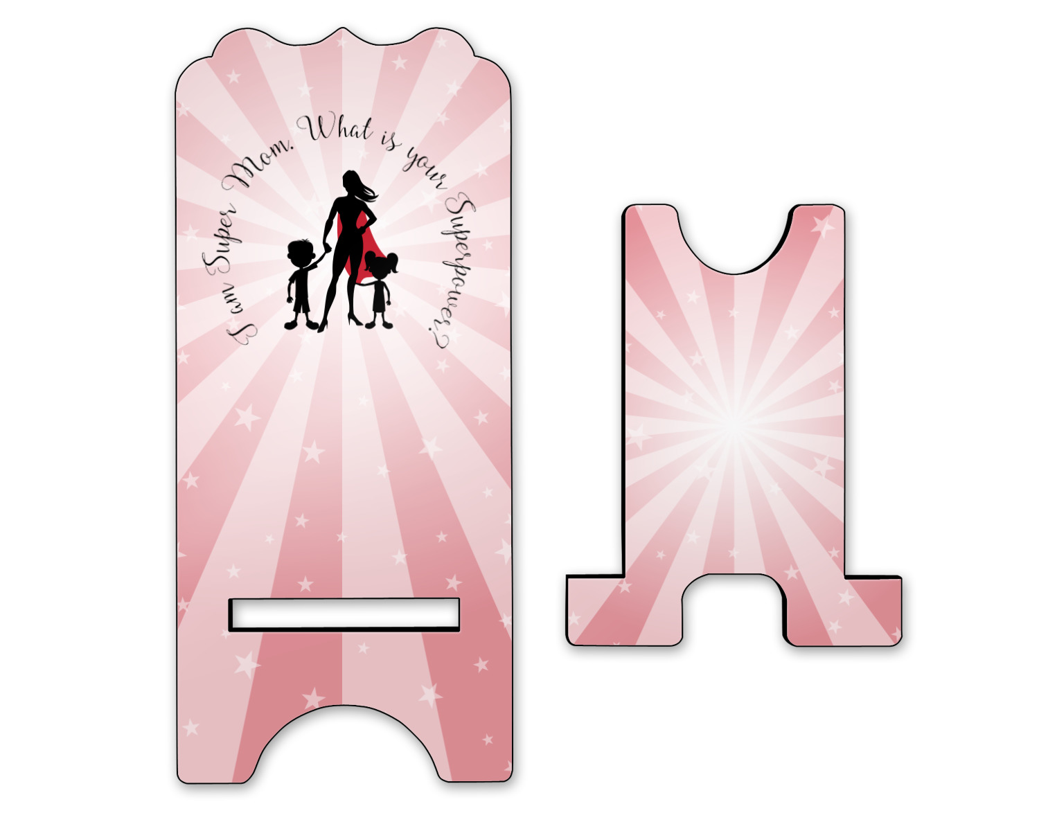 Our Super Mom design is perfect for your Mother's Day Gift. Moms today are truly super heroes with all that they have to balance. Our adorable design depicts a super hero mom / woman holding hands with a little boy and a little girl. Our super hero mom is wearing a red cape. We used a blush colored starburst with stars to highlight our beautiful mother. We personalized with our new circular text and used the words "I am a Super Mom. What is your Superpower?". We use a scripty girly font. We think the design looks outstanding!