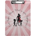 Our Super Mom design is perfect for your Mother's Day Gift. Moms today are truly super heroes with all that they have to balance. Our adorable design depicts a super hero mom / woman holding hands with a little boy and a little girl. Our super hero mom is wearing a red cape. We used a blush colored starburst with stars to highlight our beautiful mother. We personalized with our new circular text and used the words "I am a Super Mom. What is your Superpower?". We use a scripty girly font. We think the design looks outstanding!