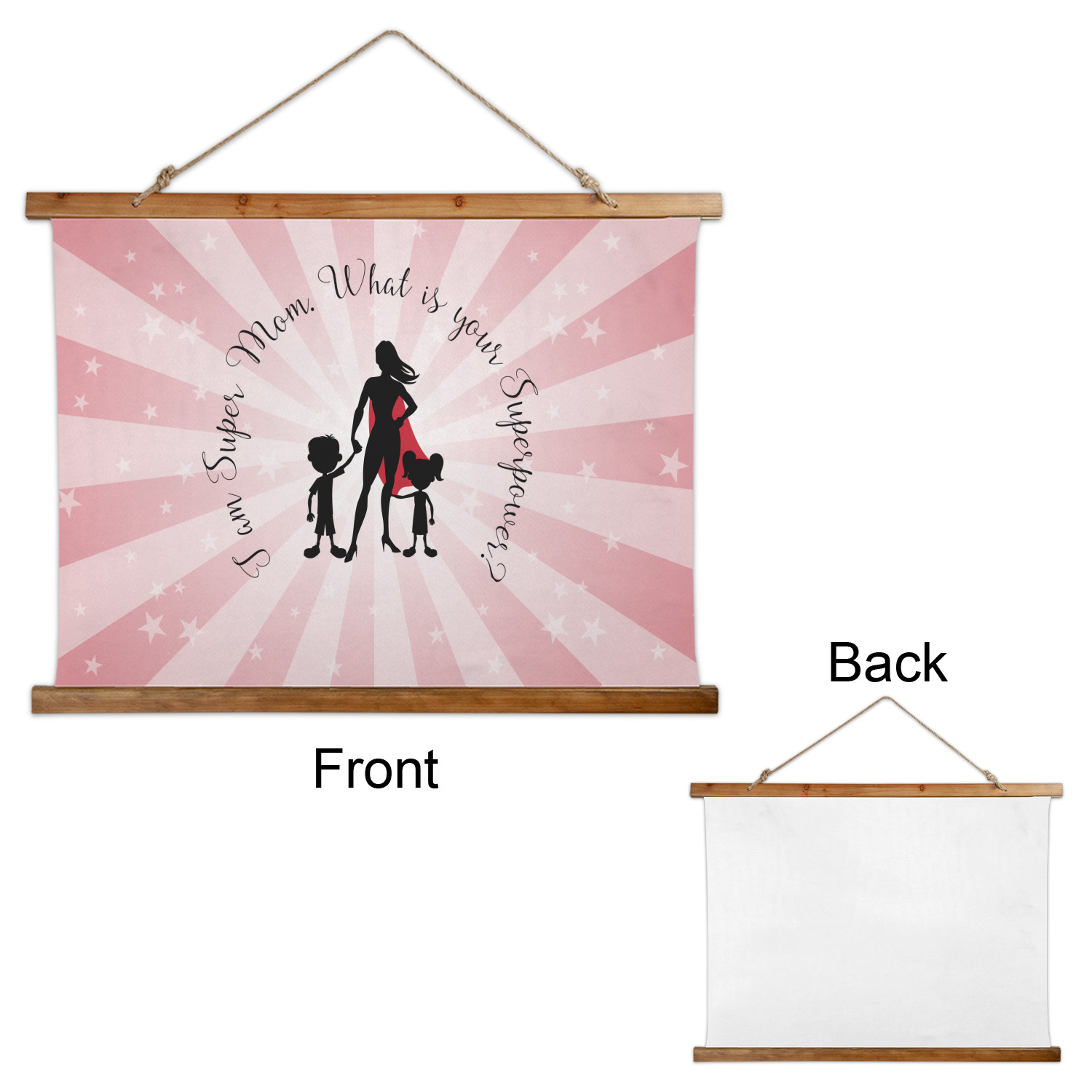 Made in two different orientations - portrait or landscape - both are 26" x 36". Your design is printed on a high quality polyester fabric with hemmed edges. The wood on the top and bottom of the tapestry is 1.25" tall and 0.25" thick and there are two pieces on top and bottom which sandwich the fabric.