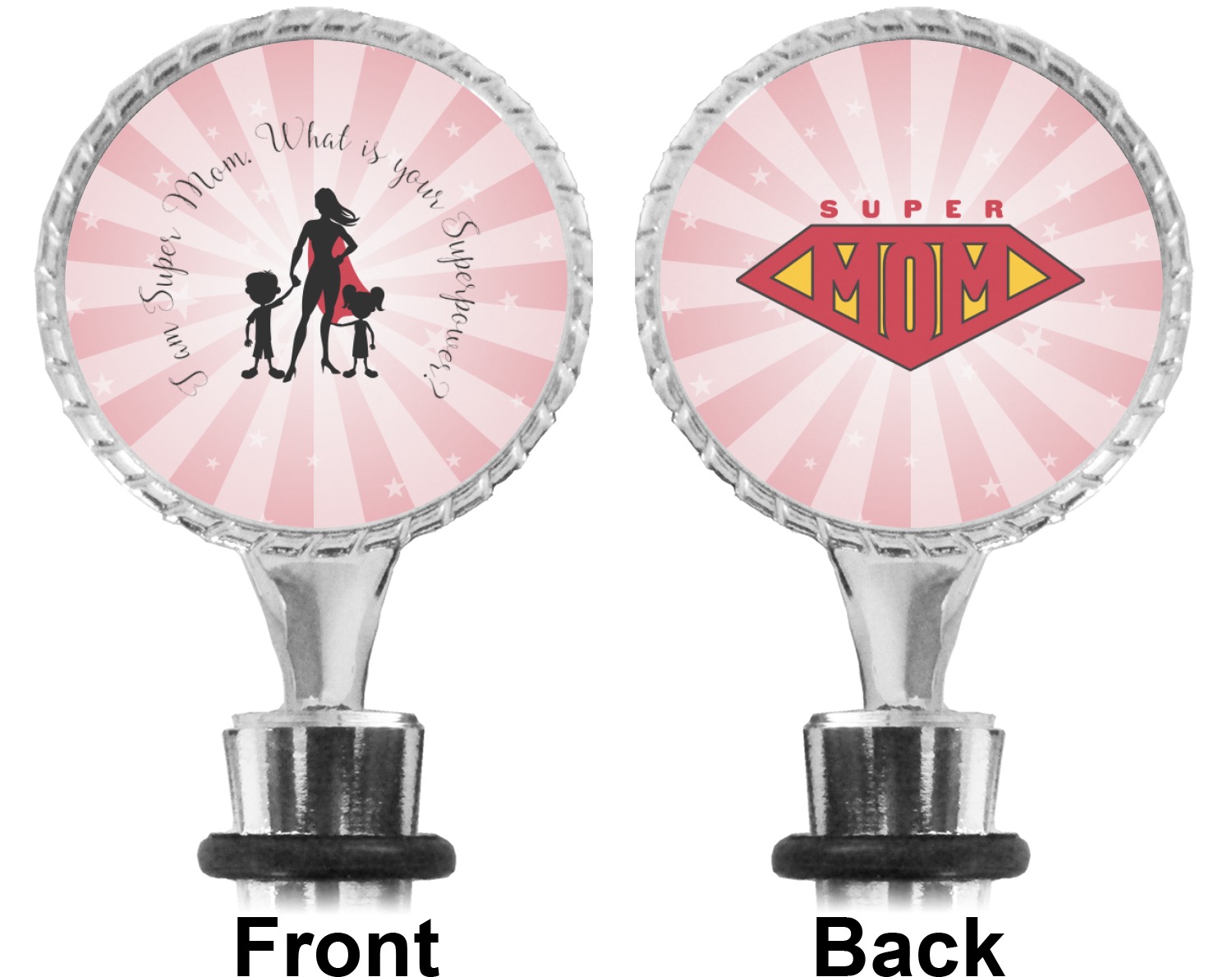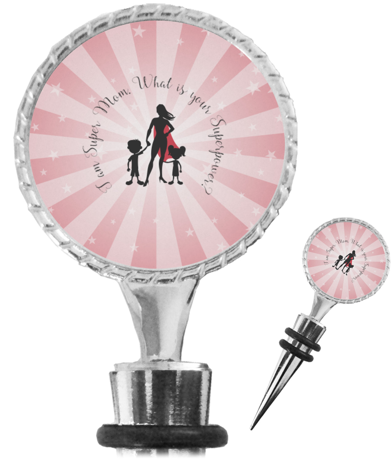 The top part of your bottle stopper is comprised of a zinc ring that displays your customization(s) in its middle, on both sides. The ring is heavy duty, with a bright chrome finish. The body of the wine stoppers have two silicone rings to provide an airtight seal. These wine bottle stoppers measure at 1.625" L x 0.8125" W x 4.625" H; your custom wine stopper is meant to fit into most standard-sized wine bottles.