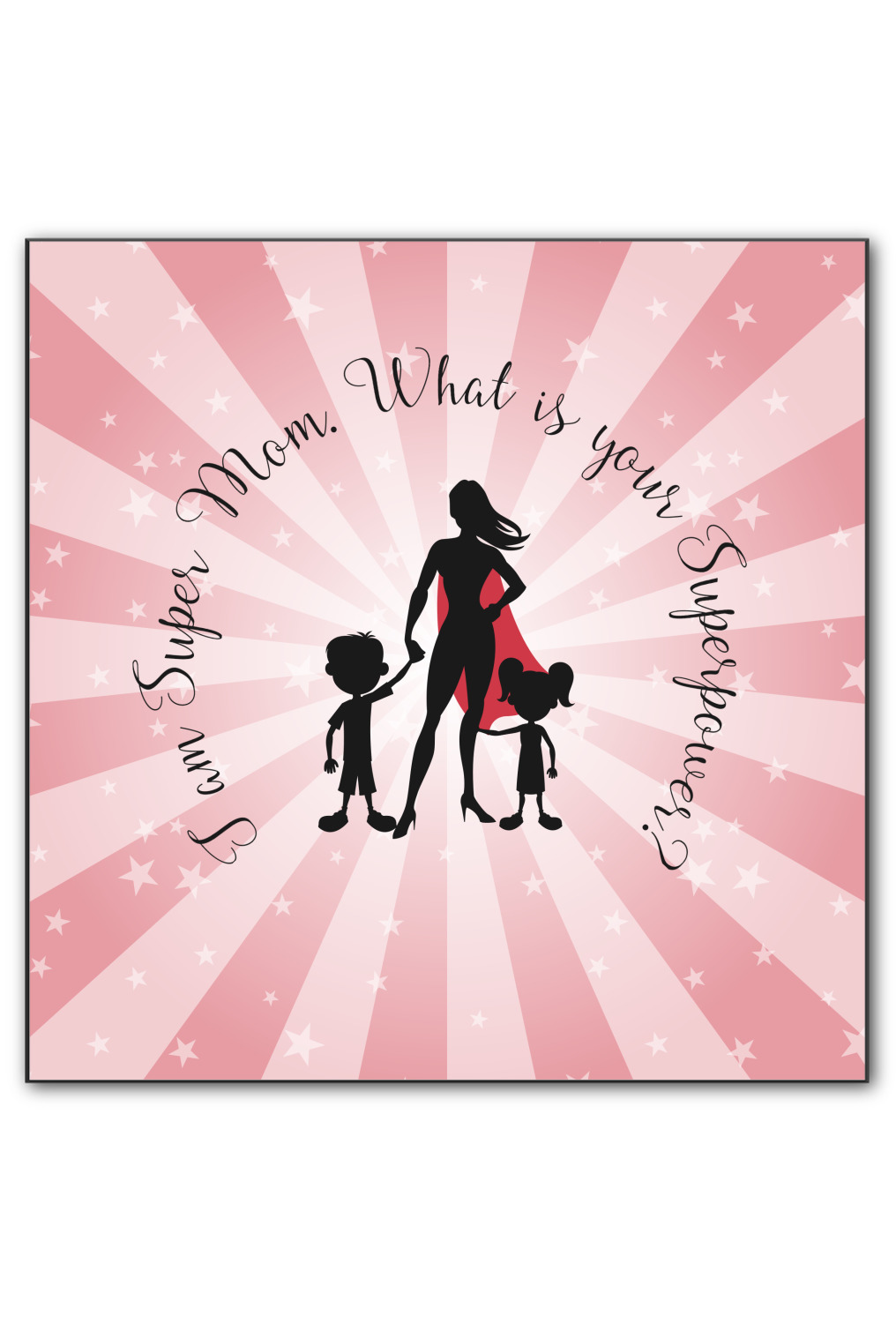 Our Super Mom design is perfect for your Mother's Day Gift. Moms today are truly super heroes with all that they have to balance. Our adorable design depicts a super hero mom / woman holding hands with a little boy and a little girl. Our super hero mom is wearing a red cape. We used a blush colored starburst with stars to highlight our beautiful mother. We personalized with our new circular text and used the words "I am a Super Mom. What is your Superpower?". We use a scripty girly font. We think the design looks outstanding!