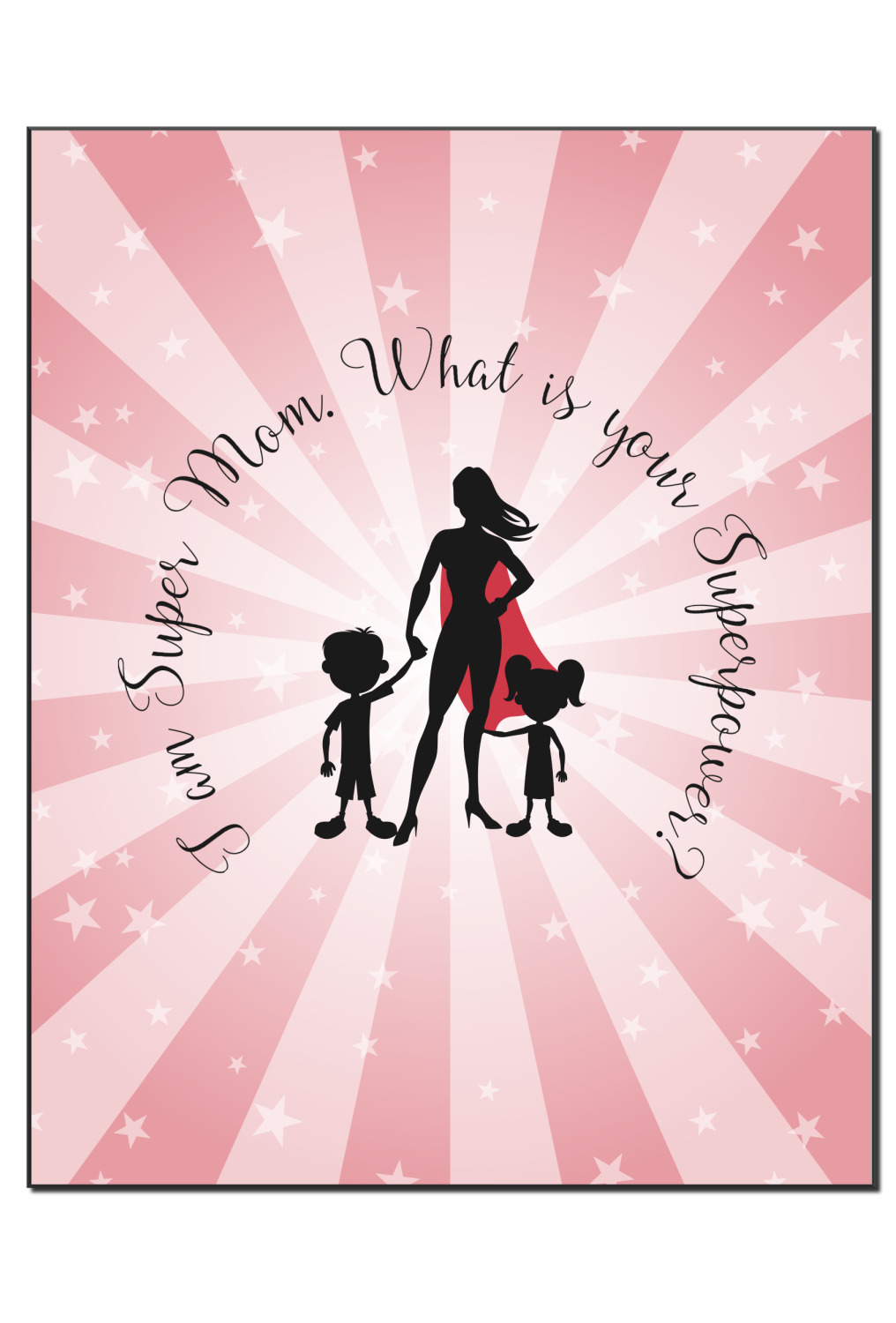 Our Super Mom design is perfect for your Mother's Day Gift. Moms today are truly super heroes with all that they have to balance. Our adorable design depicts a super hero mom / woman holding hands with a little boy and a little girl. Our super hero mom is wearing a red cape. We used a blush colored starburst with stars to highlight our beautiful mother. We personalized with our new circular text and used the words "I am a Super Mom. What is your Superpower?". We use a scripty girly font. We think the design looks outstanding!