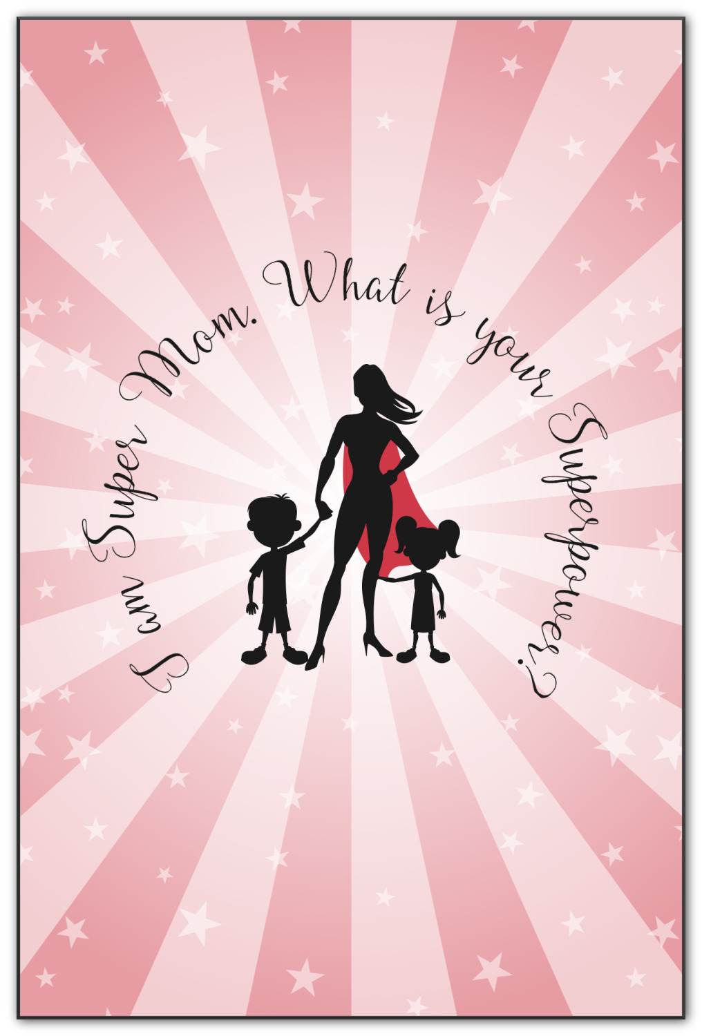 Our Super Mom design is perfect for your Mother's Day Gift. Moms today are truly super heroes with all that they have to balance. Our adorable design depicts a super hero mom / woman holding hands with a little boy and a little girl. Our super hero mom is wearing a red cape. We used a blush colored starburst with stars to highlight our beautiful mother. We personalized with our new circular text and used the words "I am a Super Mom. What is your Superpower?". We use a scripty girly font. We think the design looks outstanding!