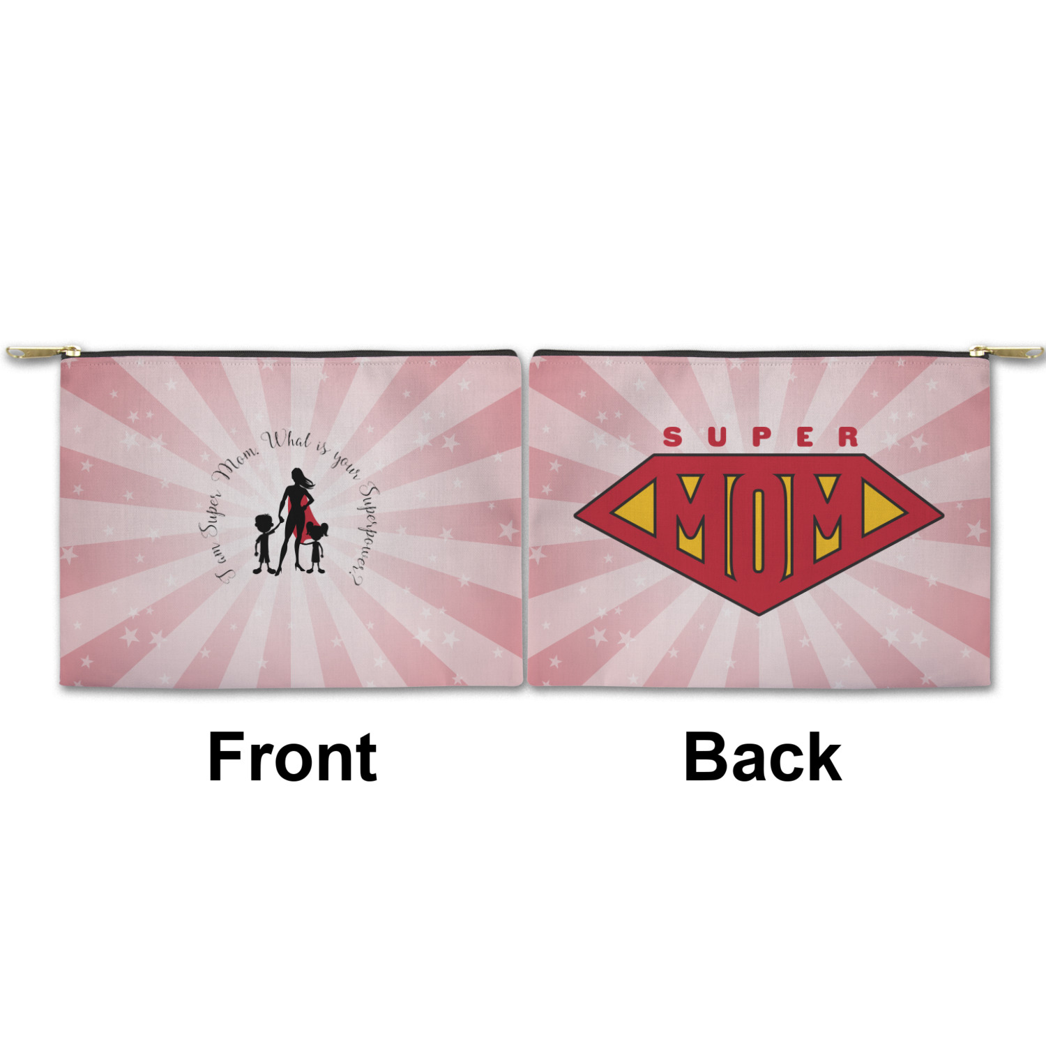 Our zippered pouches are available in two sizes - small: approx 8.5W"x6H and large: approx 12.5Wx8.5H. The pouches are made from a soft & durable canvas fabric that is printed on the outside with your design; the inside has a fused black lining. The printed canvas fabric is then cut and the pouches are sewn right here in the USA. The zipper itself is gold in color and has a round hook.