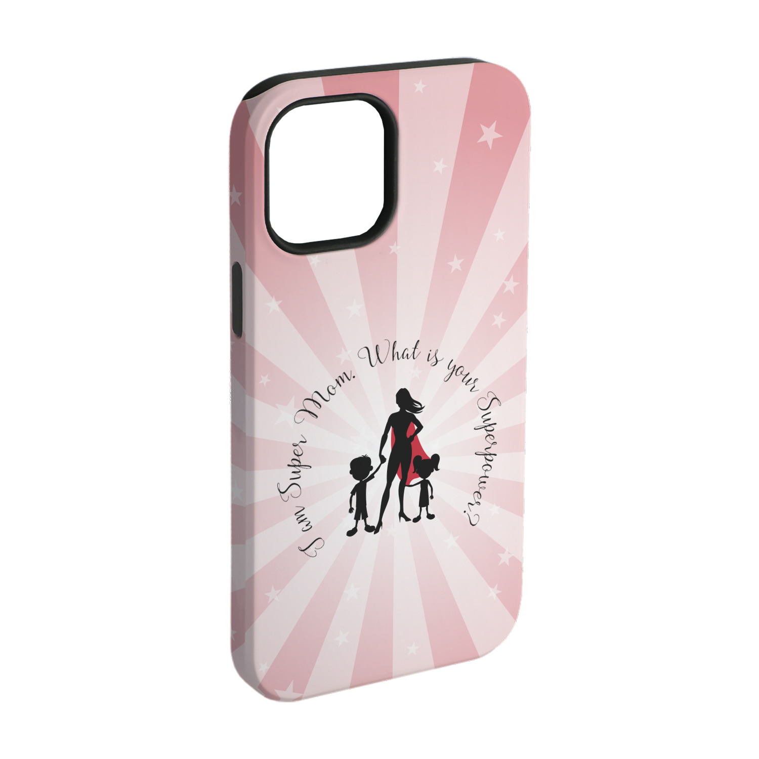 Our Super Mom design is perfect for your Mother's Day Gift. Moms today are truly super heroes with all that they have to balance. Our adorable design depicts a super hero mom / woman holding hands with a little boy and a little girl. Our super hero mom is wearing a red cape. We used a blush colored starburst with stars to highlight our beautiful mother. We personalized with our new circular text and used the words "I am a Super Mom. What is your Superpower?". We use a scripty girly font. We think the design looks outstanding!