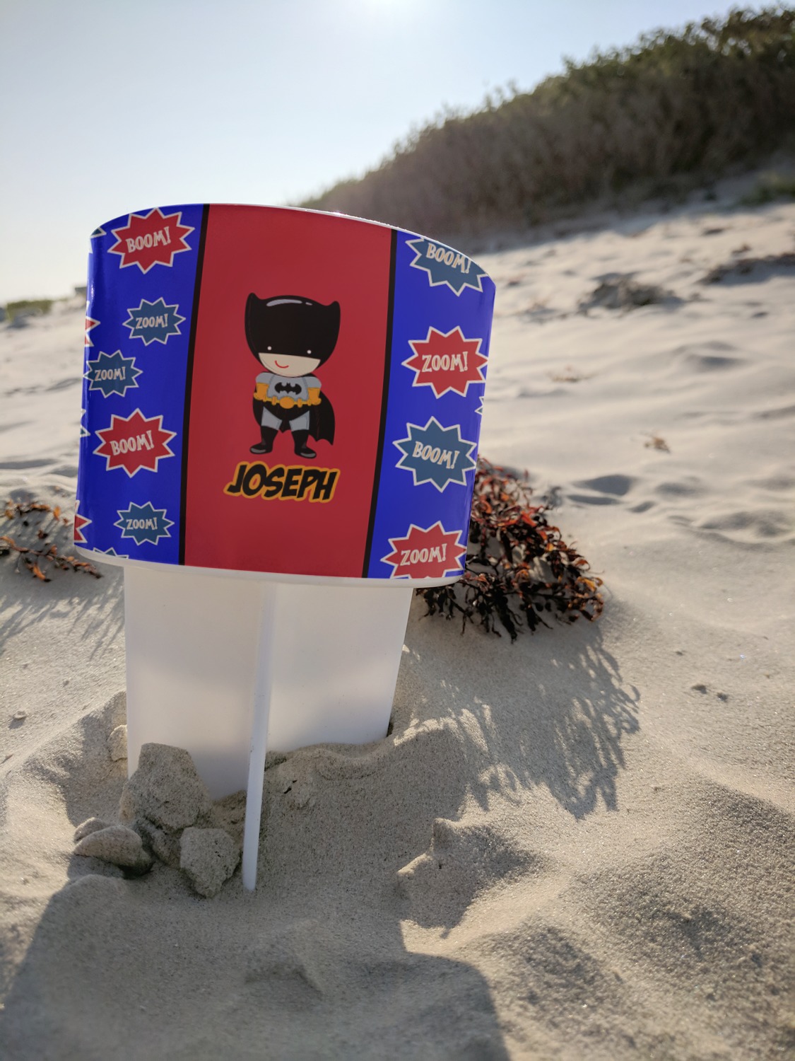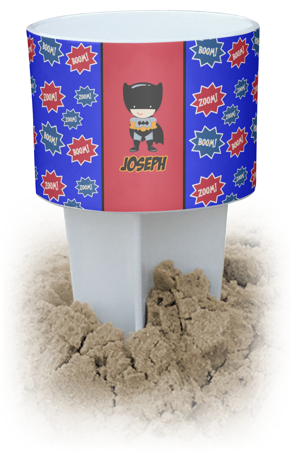 This cup holder has a large stake at its bottom that anchors it to the sand or ground below, while the cup holder rests above the stake. The entire drink holder is made of durable plastic and displays your customization around the cup holder portion. We sell these personalized beach spikers in two different colors: black and white.