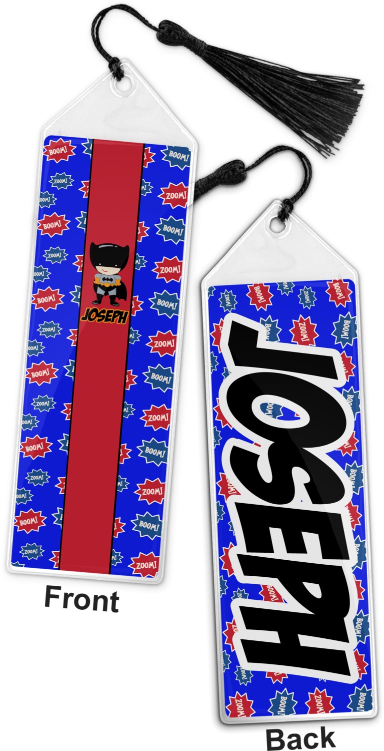 Your personalized bookmark is made of a sturdy, clear vinyl, and is approximately 7.5" x 2.25". We display your personalization on vinyl inserts that are placed on both sides. Accompanying each book marker is a black, fringe tassel that attaches to the reinforced, triangular header.
