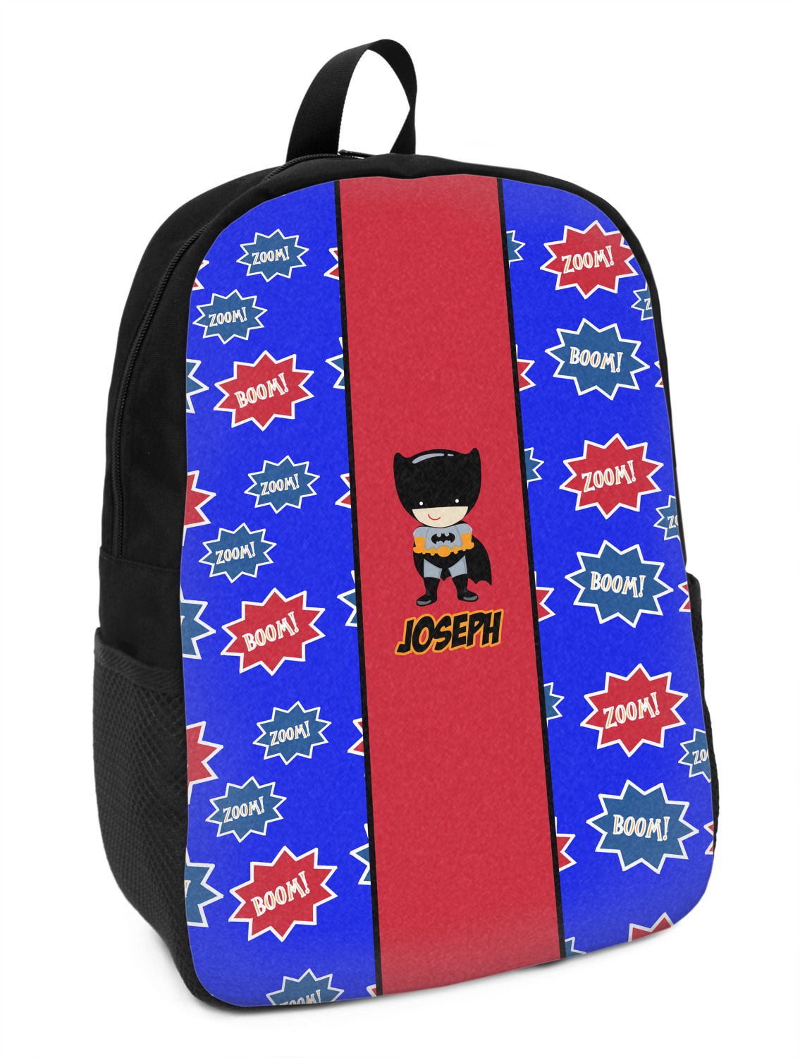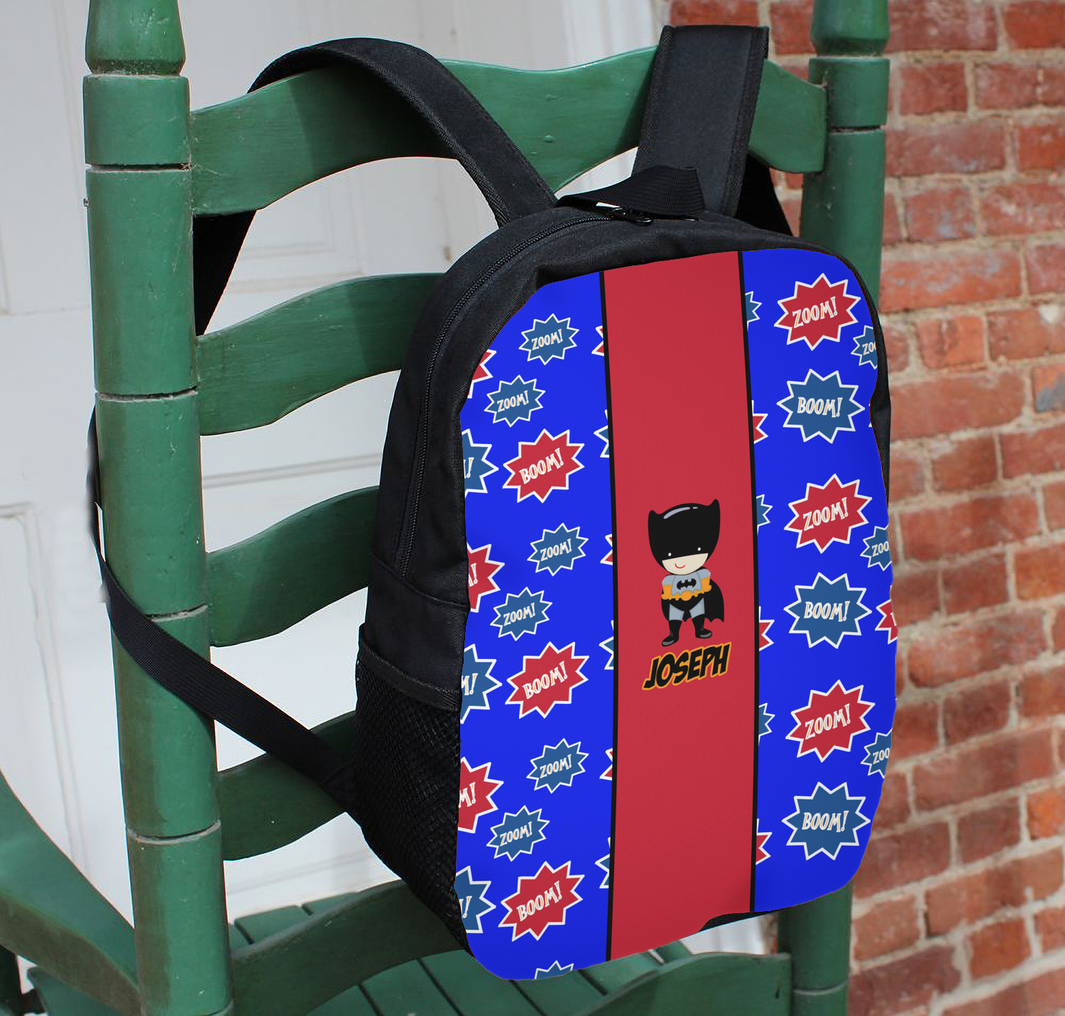 These small backpacks are made of a durable black canvas material with your personalization right on the front. The two shoulder straps are padded and easily adjustable. The bag itself measures at about 11" W x 15" H x 5" D. It's the perfect size for elementary aged kids or adults who want a smaller backpack. On the top of the bag you will find a handle to hang or carry your backpack by as well as a large zipper closure to keep all of your belongings safe inside. On each side of your backpack is a mesh pocket for a small item or water bottle. Inside your backpack you will find a spacious area with a small zipper pocket and a padded laptop slot that will fit up to a 13" laptop (13" being very snug). This is the perfect bag for any student that needs a couple books and their laptop with them at all times. It also works great as a carry on for traveling!