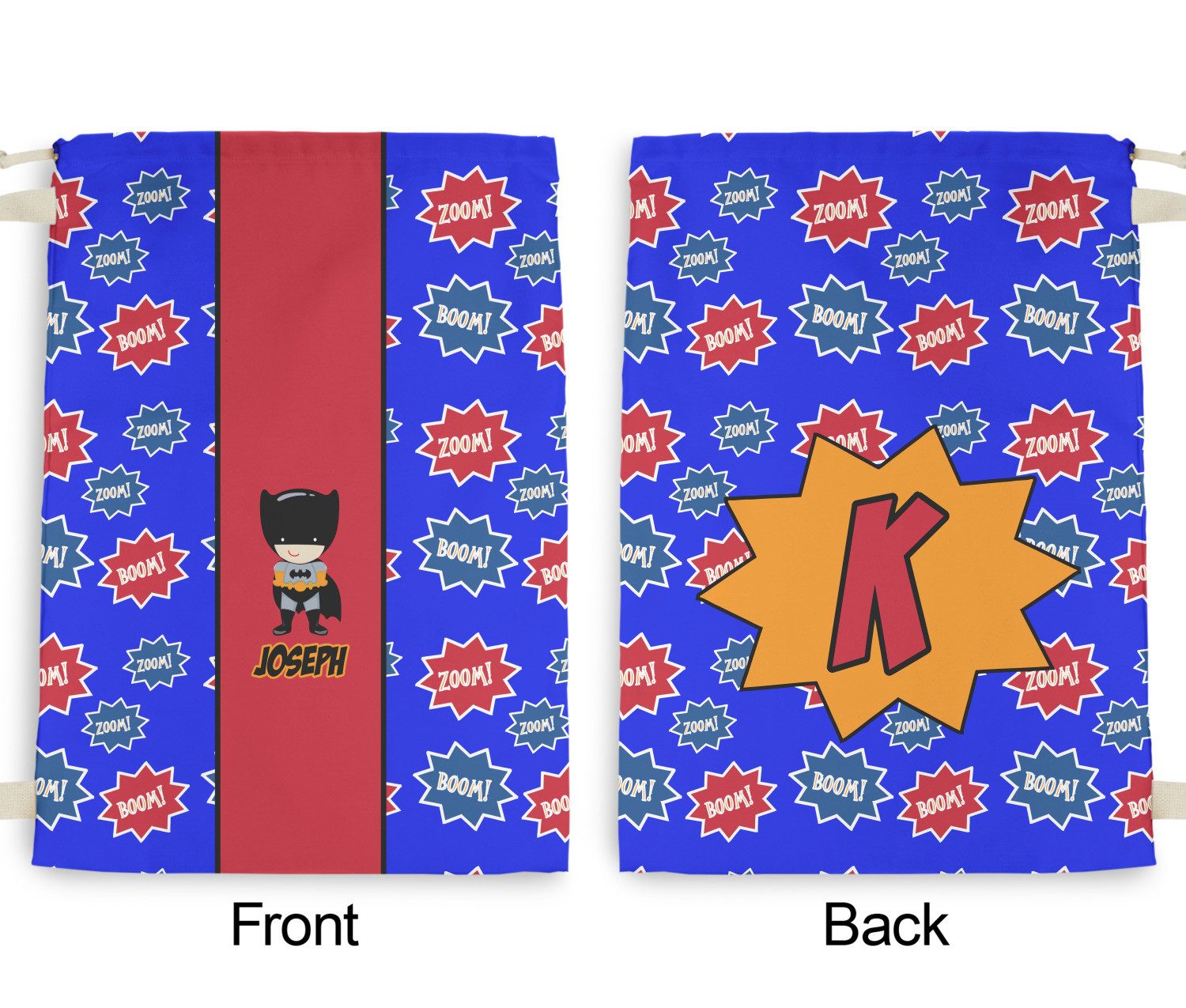 Carry your laundry in style with these customized laundry bags. Available in two sizes, featuring a natural colored woven strap and a cinch cord, these bags hold a lot of clothes or anything else you want to fit in them.