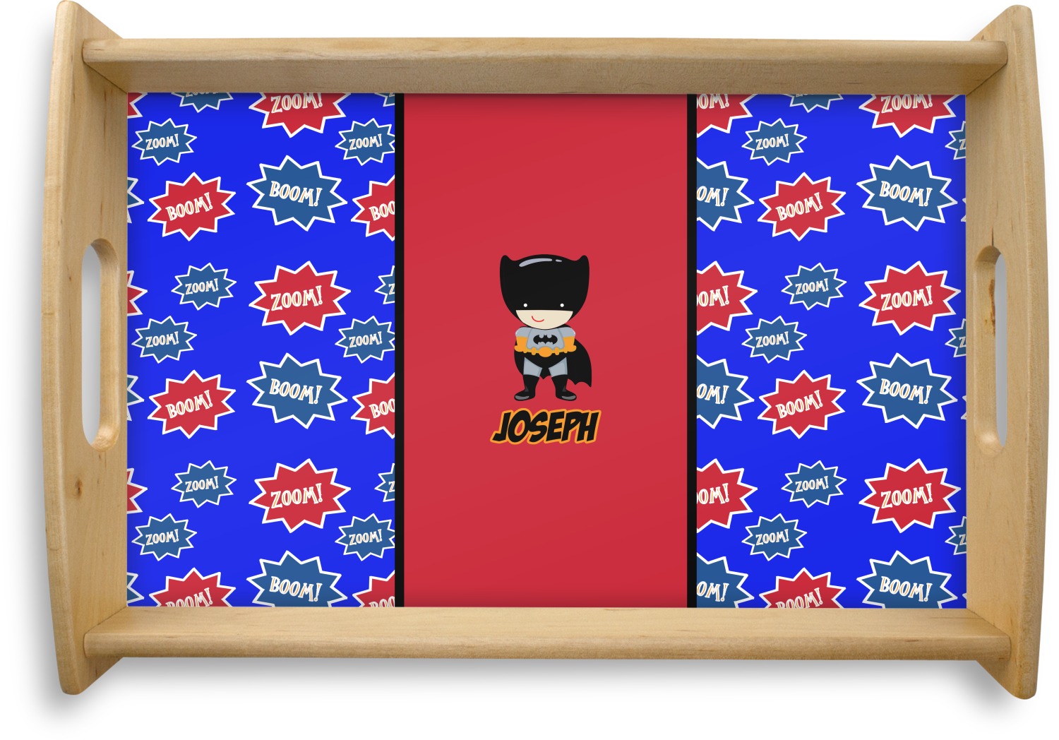 This serving tray with handles features square edges and two rounded sides, creating a very modern look. Each side is fabricated from a beautifully cut, natural wood. The bottom of the interior of the tray displays your customized design in bright, vibrant color. The tray is sold in both a black color and a natural wood look. Each variation of the wood serving tray has two sizes: Small, which is 14" x 10" x 2.25", and Large, which is 19.5" x 13.5" x 2.75".