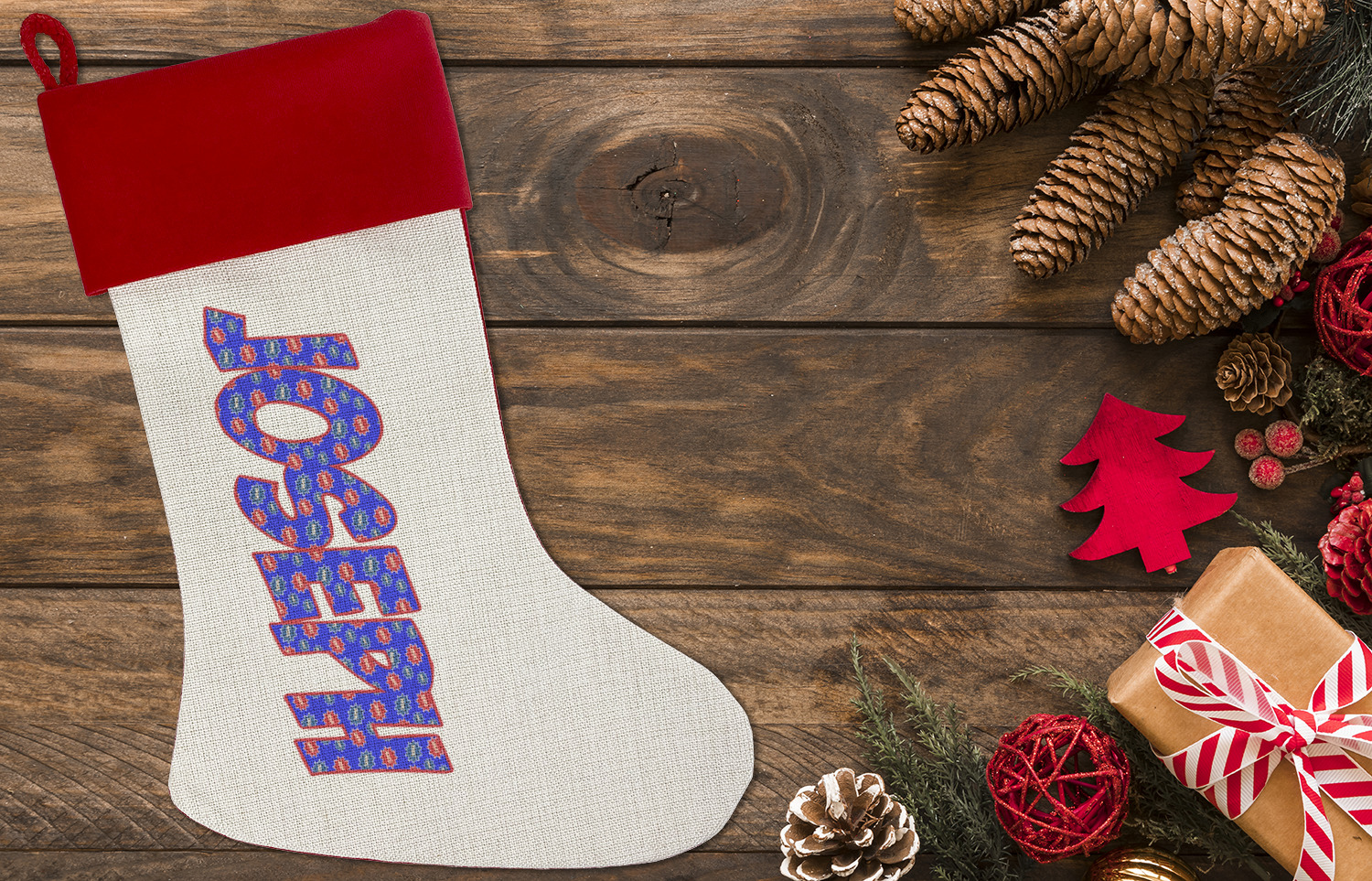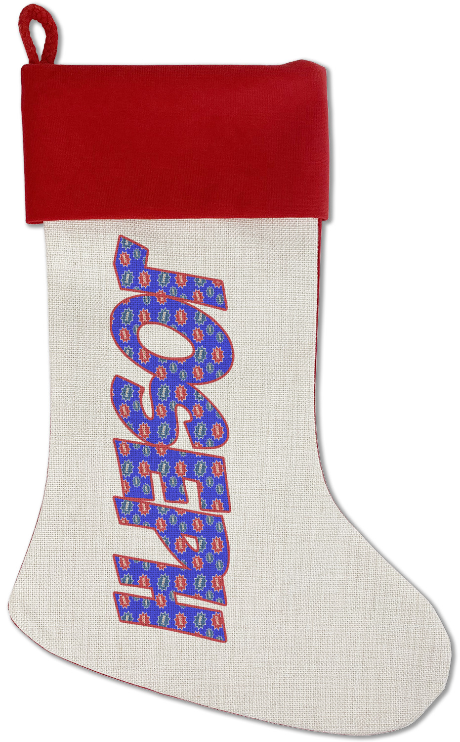 Our classic red stockings are made from a soft, yet durable polyester material perfect for any stocking stuffer! The front of our Christmas stockings have a linen front that boldly displays your custom design accented with a lush red cuff resting all around the stocking. Each stocking is approximately 18x12 with a durable cotton rope loop for hanging.