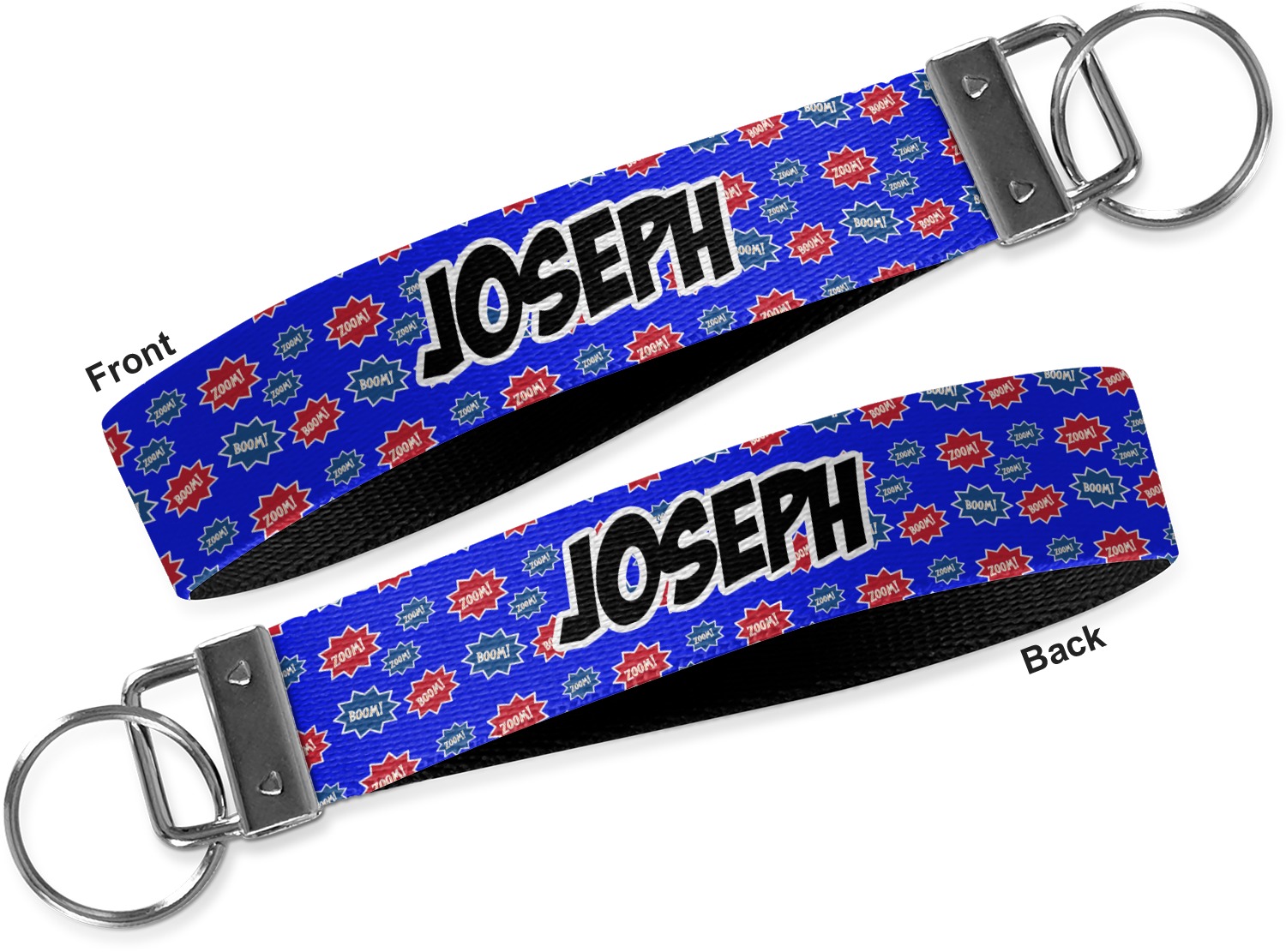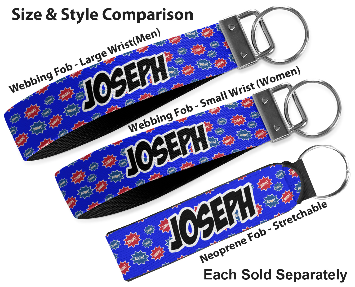 These key fob keychains are made from a polyester weave, right here in the USA. They feature a silver, metal clasp, attached to a round keyring. The piece gives the personalized wristlet a beautiful, finished look. Your customized design is printed on the outside of the keychain strap. We carry these wristlets in two sizes: small, which is 5 inches in width, and large, which is 5.5 inches in width.
