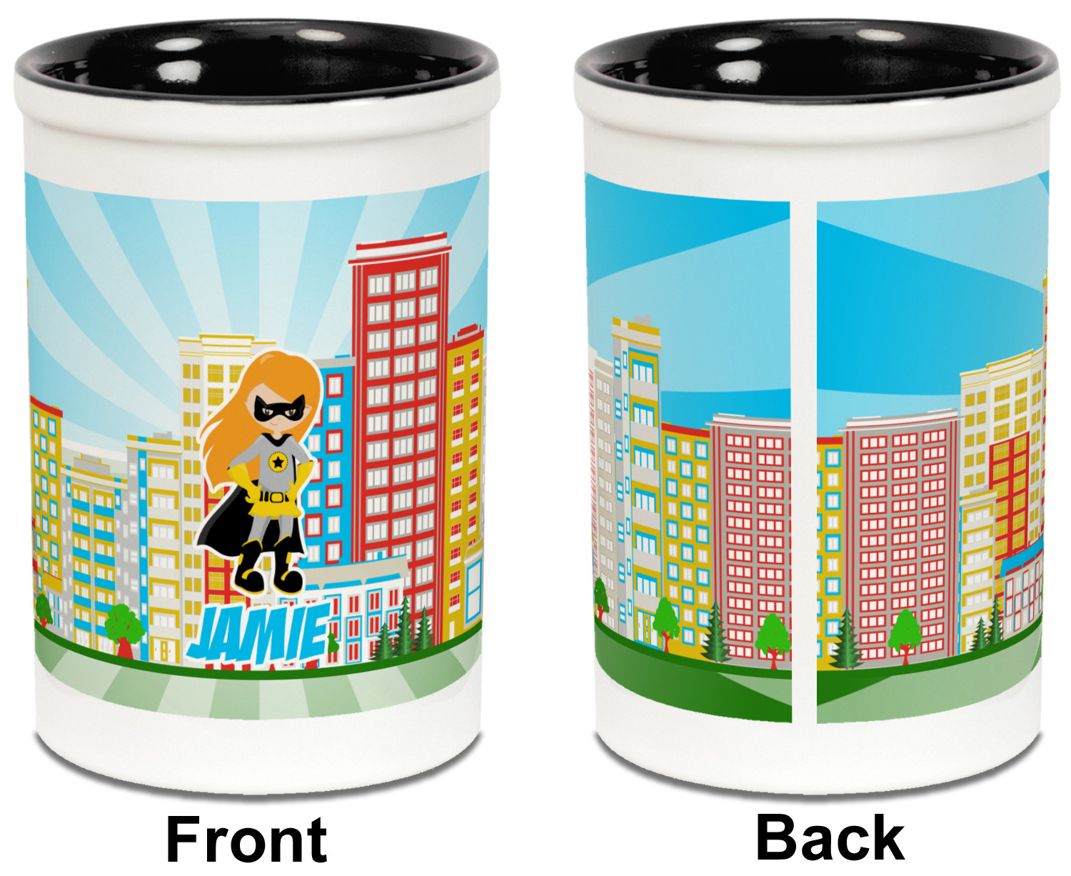 Both the blue and black pencil holders are a ceramic material, giving you a sturdy and long-lasting pen and pencil holder. We print your designs on the exterior of the pencil cup, covering most of the outside surface. There is a small white border on the top and bottom of the exterior of the pen holder, setting apart your design from the interior's color. Our ceramic pen caddy is roughly 3.5" x 3.5" x 5" in dimensions.