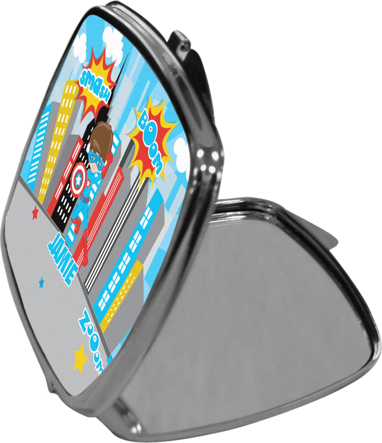 Our compact mirrors are customized with your design on one side. The other side is patterned silver tone metal. Inside, there are two mirrors.