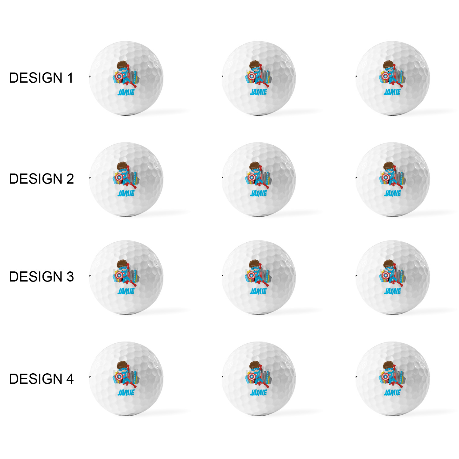 Printed in a 7/8" circle on each ball, you can customize these with our design studio or use your own designs. For a set of 3 you can design each one individually, for a set of 12 you will be able to use 4 unique designs and will receive 3 balls with each design.