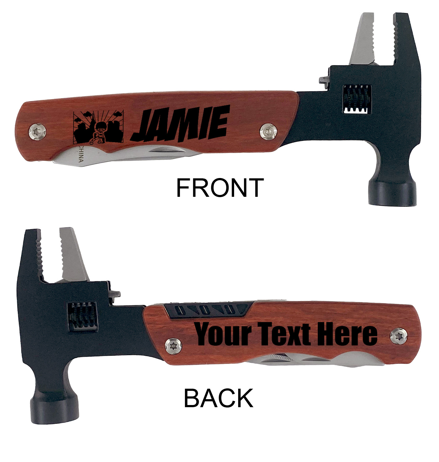 This multitool has all the tools you need on a daily basis. This multi-tool has a knife, file, bottle and can opener, screwdriver, and a hex nut wrench as well as the hammer and an adjustable wrench. The rosewood handle can be laser engraved on one or both sides to your liking to add that special personal touch for the user. Includes a black fabric pouch with belt loop for storage. Also includes white gift box.