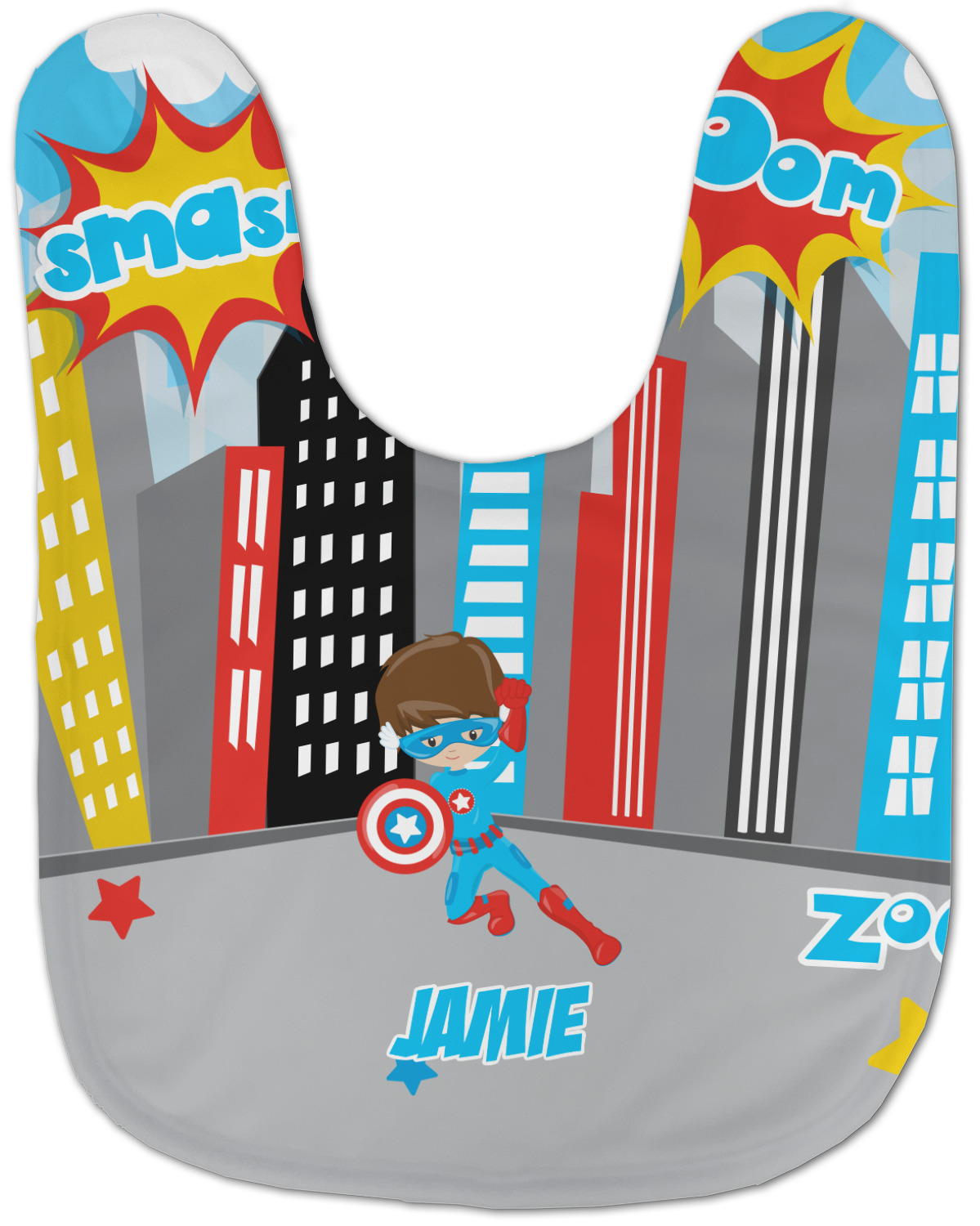Made of soft polyester, each customizable bib hugs comfortably around the neck to catch every drip and drool. Each bib design is printed with baby-safe ink and finished with a secure stitch pattern and velcro clasp. We carry two customizable bib styles -Microfiber Velour and Jersey Knit.