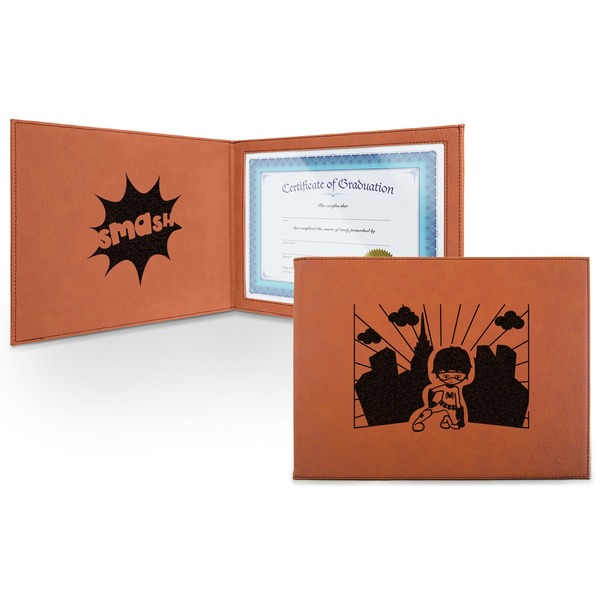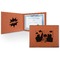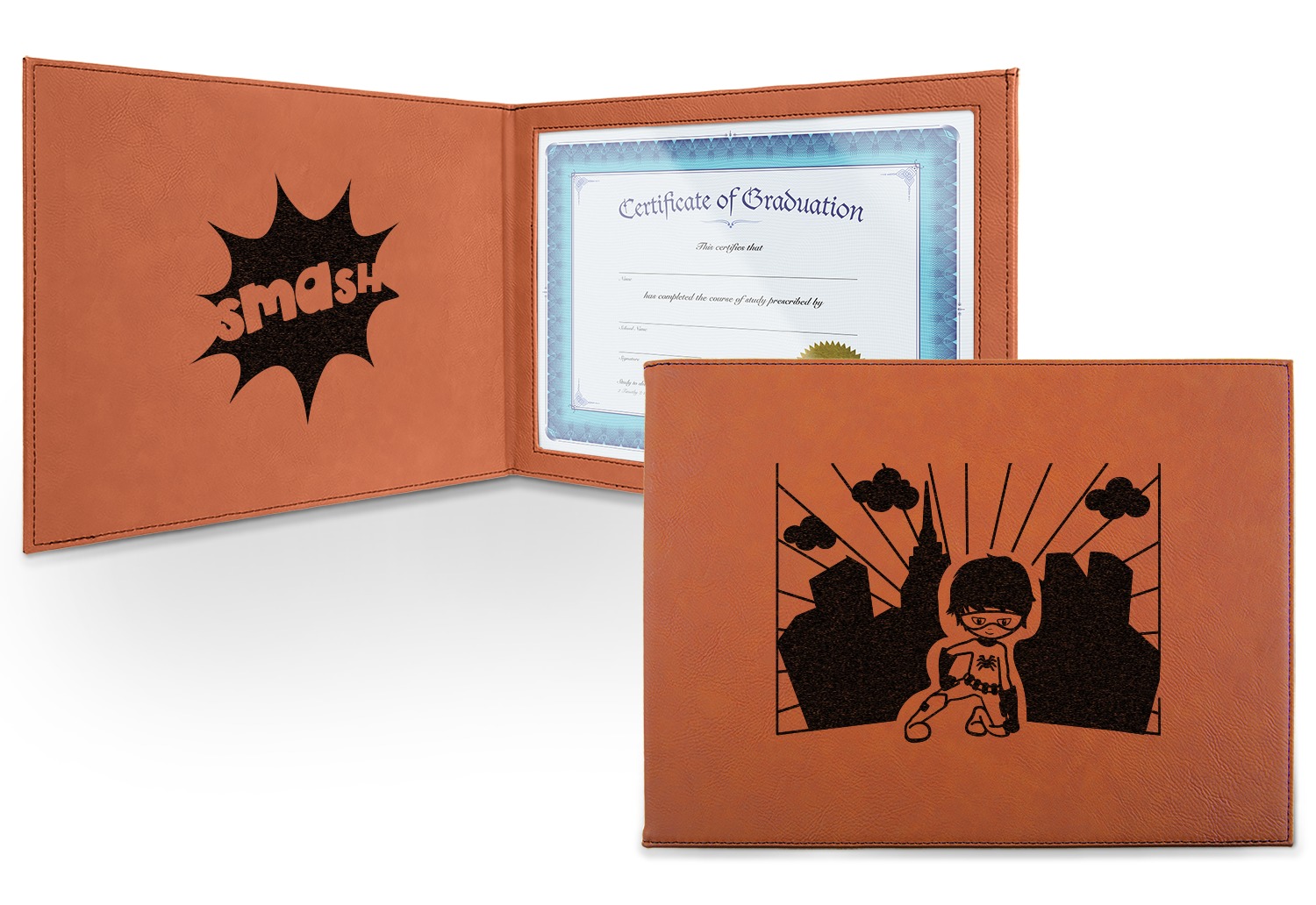 This cognac-colored, leatherette certificate jacket is the ideal way to display or store your hard-earned certificate. When closed, the custom certificate holder measures at 12 by 9 inches. The interior of the certificate cover includes a clear, vinyl window to encase your diploma. The window measures at around 10.5 by 7.5 inches and can accommodate a diploma that measures at up to 8.5 by 11 inches. You can either choose to have your customization laser engraved on the front and interior, or solely the front.