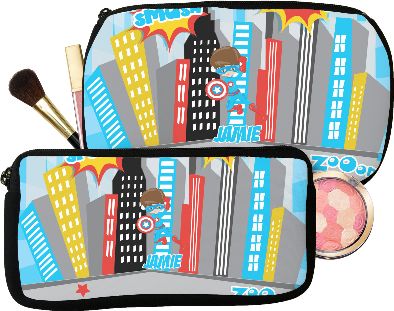 Our personalized makeup bags are available in many different designs, patterns and colors - so you are sure to find one that will love. They are made of neoprene (same material as wet-suits) and thus are water resistant, so spillages in your makeup bag will not end up all over you purse. They are customized on one side and are black on the other side and the zipper is black as well.