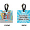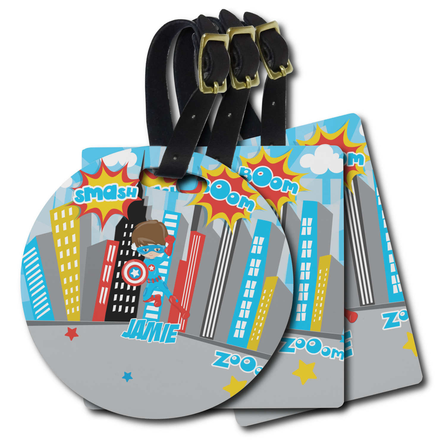 These personalized bag tags are sold in a variety of shapes, so that you may find the product that meets your vision exactly. We sell a round luggage tag, which measures at approximately 4" x 4". Our square luggage tag is about 3.5" x 3.5", while our rectangular version is 2.75" x 4 ".