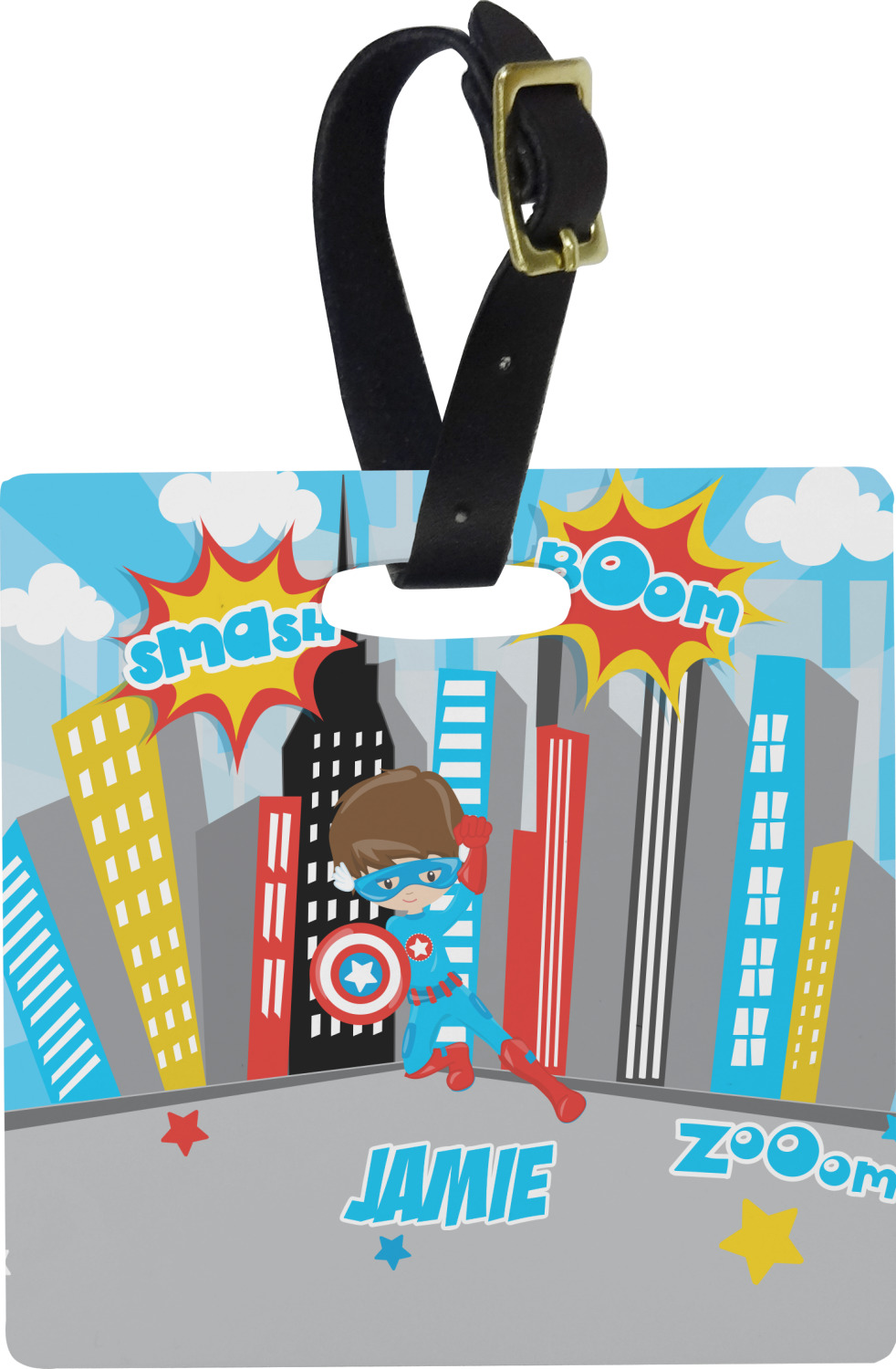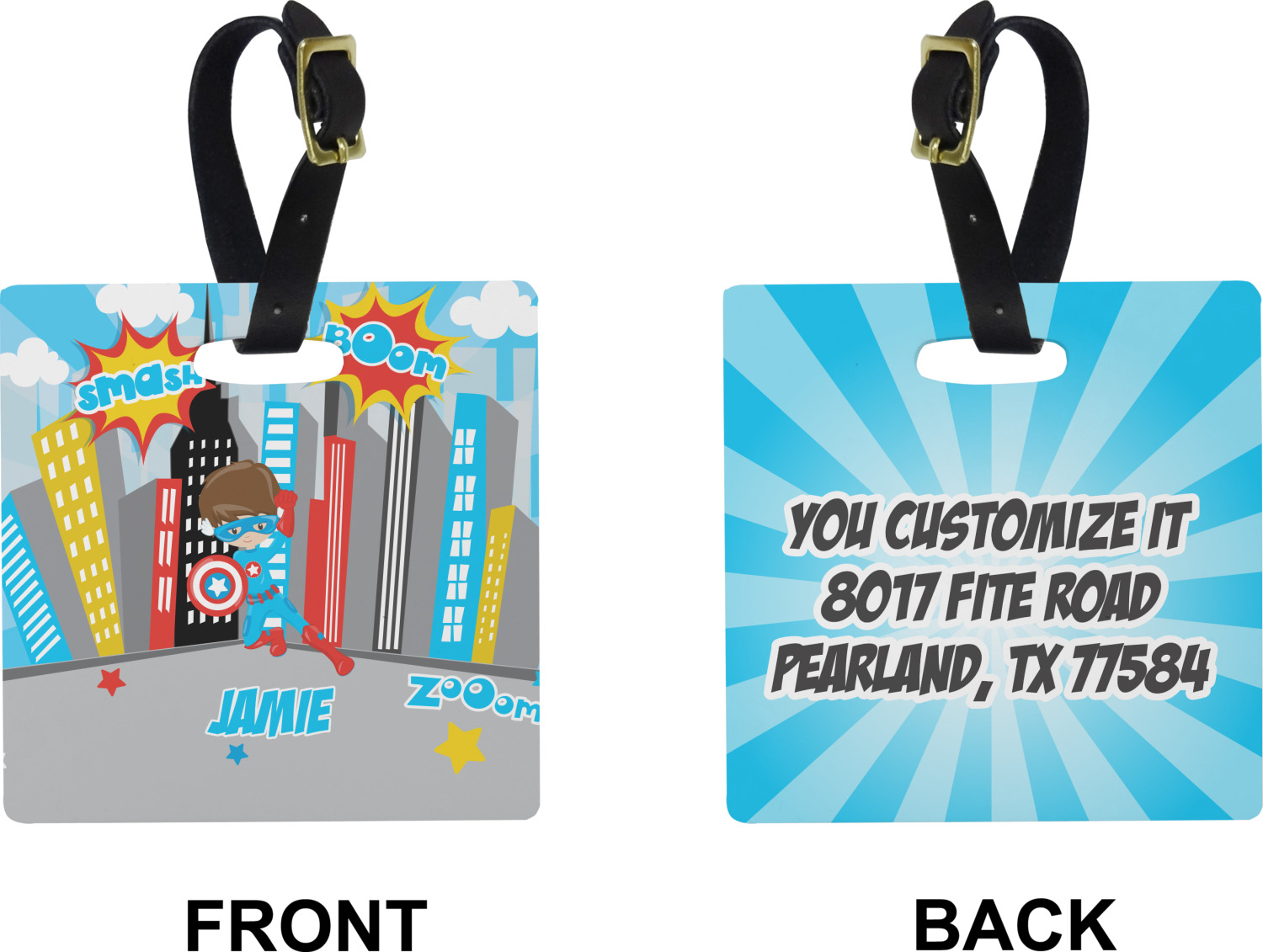 These cute luggage tags are made of a fiber-reinforced, UV-resistant plastic, making them waterproof and durable enough for both everyday use and the rugged adventures of any traveler! A leather strap with holes and a buckle is included with your purchase and can be used to attach your custom luggage tag to any suitcase, backpack, or duffel bag. You can design these travel tags as you wish; your customization will be displayed across the front, while the back will show as little or as much personal information as you want.