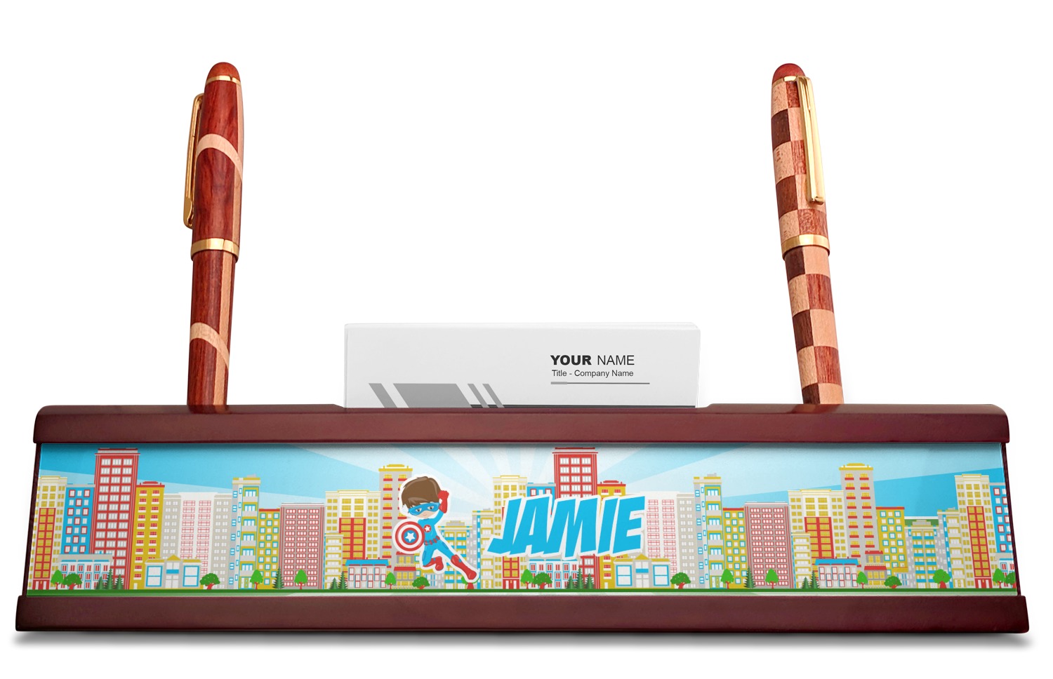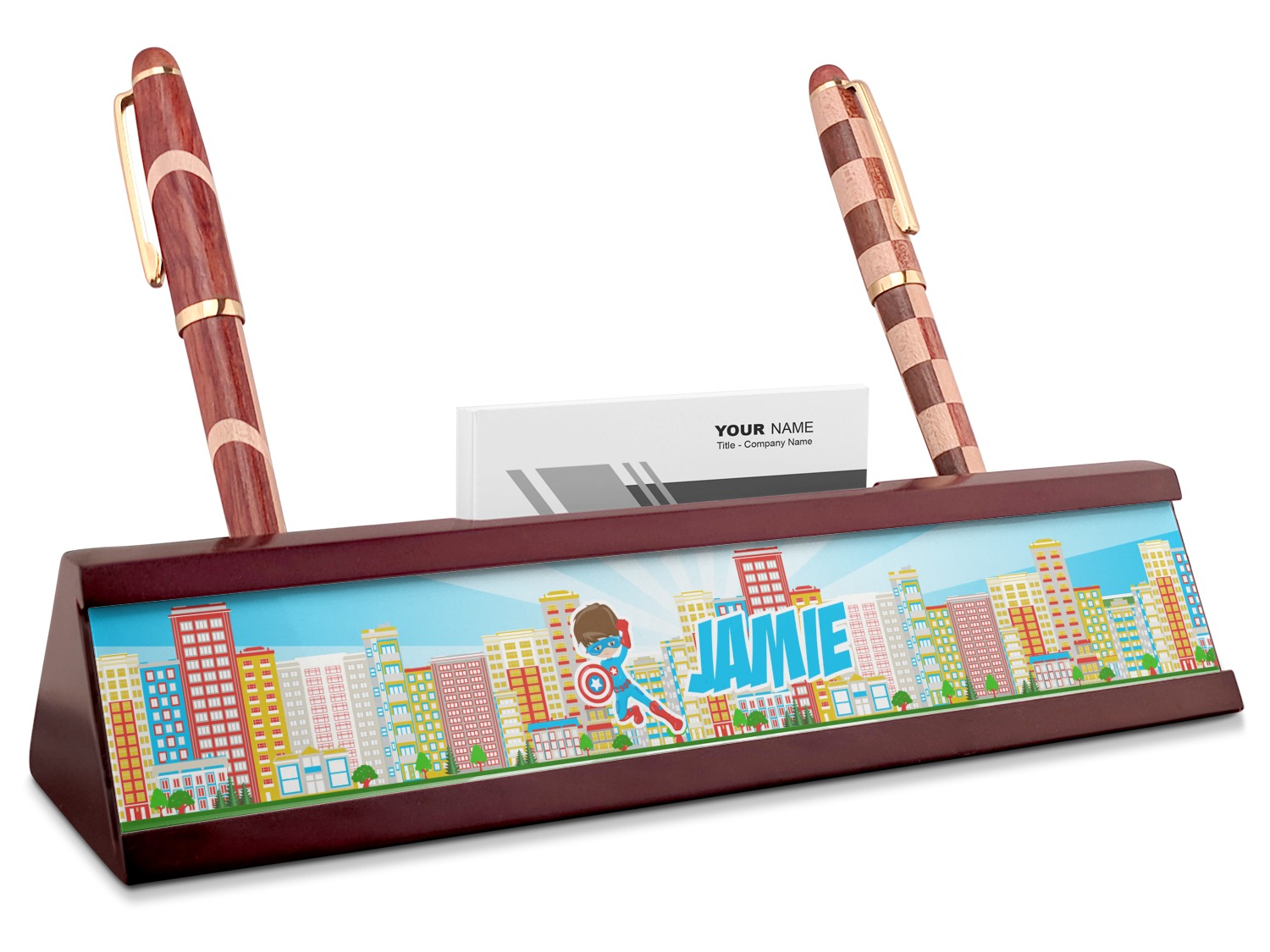 Your desk name plates are crafted from a high-quality, dark-cherry mahogany. At approximately 9.5 by 1.875 by 2.5 inches, this name plaque will fit perfectly, front and center, on your desk. Your customization spans across the entire face of the nameplate. Behind the nameplate lies a skinny slot that can fit approximately 15, traditionally-sized, business cards. You can also store your writing utensils on either side of this custom desk name plate.