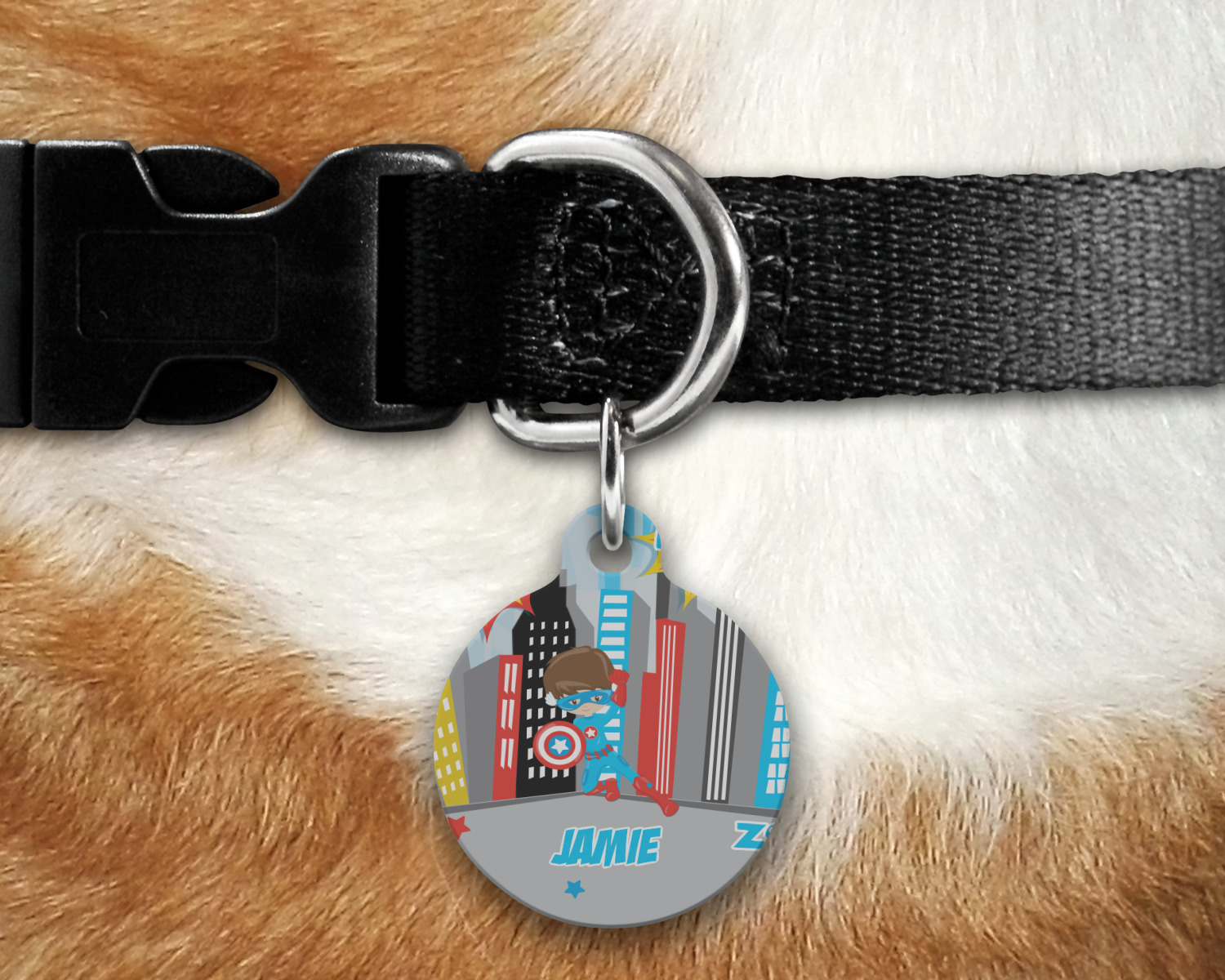 Go ahead; skip the monotony of plain pet ID tags with your very own, customized & personalized, round pet tag! This pet ID tag, fitting for both cats and dogs, will catch the eye of any onlooker (humans, canines, and felines, alike!) and accentuate your pet's individual personality.