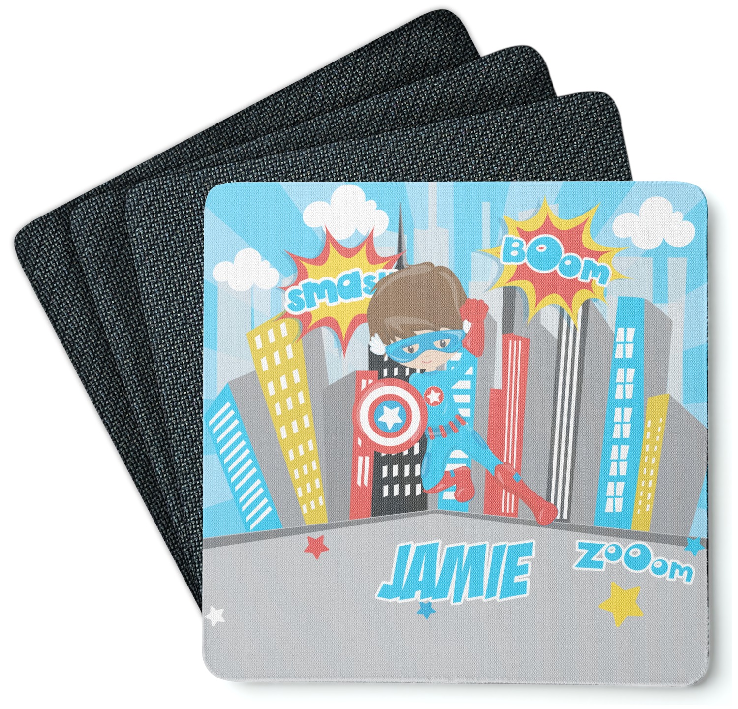 These drink coasters have a smooth, polyester top and a textured, rubber backing on its bottom. The non-slip rubber backing underneath works to keep any spills at bay. At 4 by 4 by 0.25 inches thick, these custom coasters are a suitable size for most drinkware. Your personalization is displayed atop the face of the cup coaster. We sell these rubber coasters in two different shapes: square and round. You can buy each shape as singulars or as a set of 4.