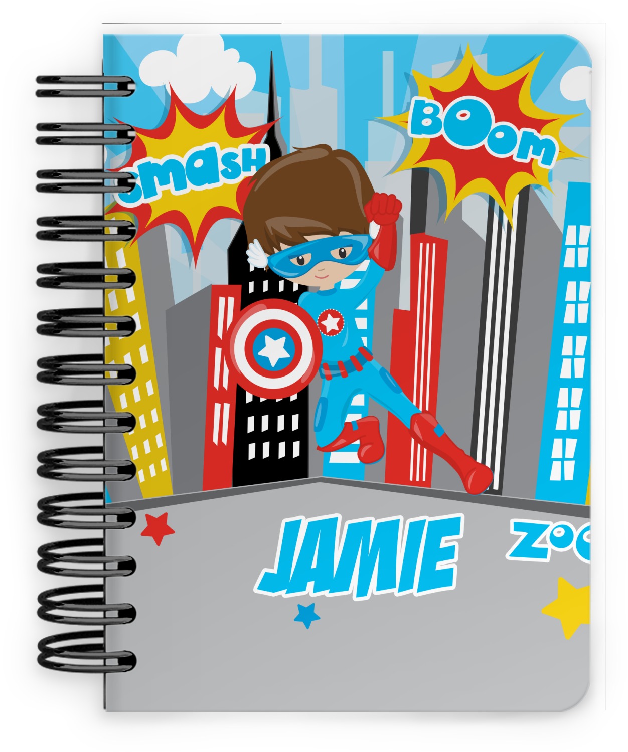 This spiral notebook includes 75 sheets of thick, ruled paper. The front and back of this custom notebook is made of a robust, laminate, plastic covering. We print your personalization on these two panels, underneath a glossy finish, which emphasizes the colors of your design. The two panels and the sheets of paper are held together by a sturdy, black coil. The paper within your bound notebook is perforated for easy, clean tearing.