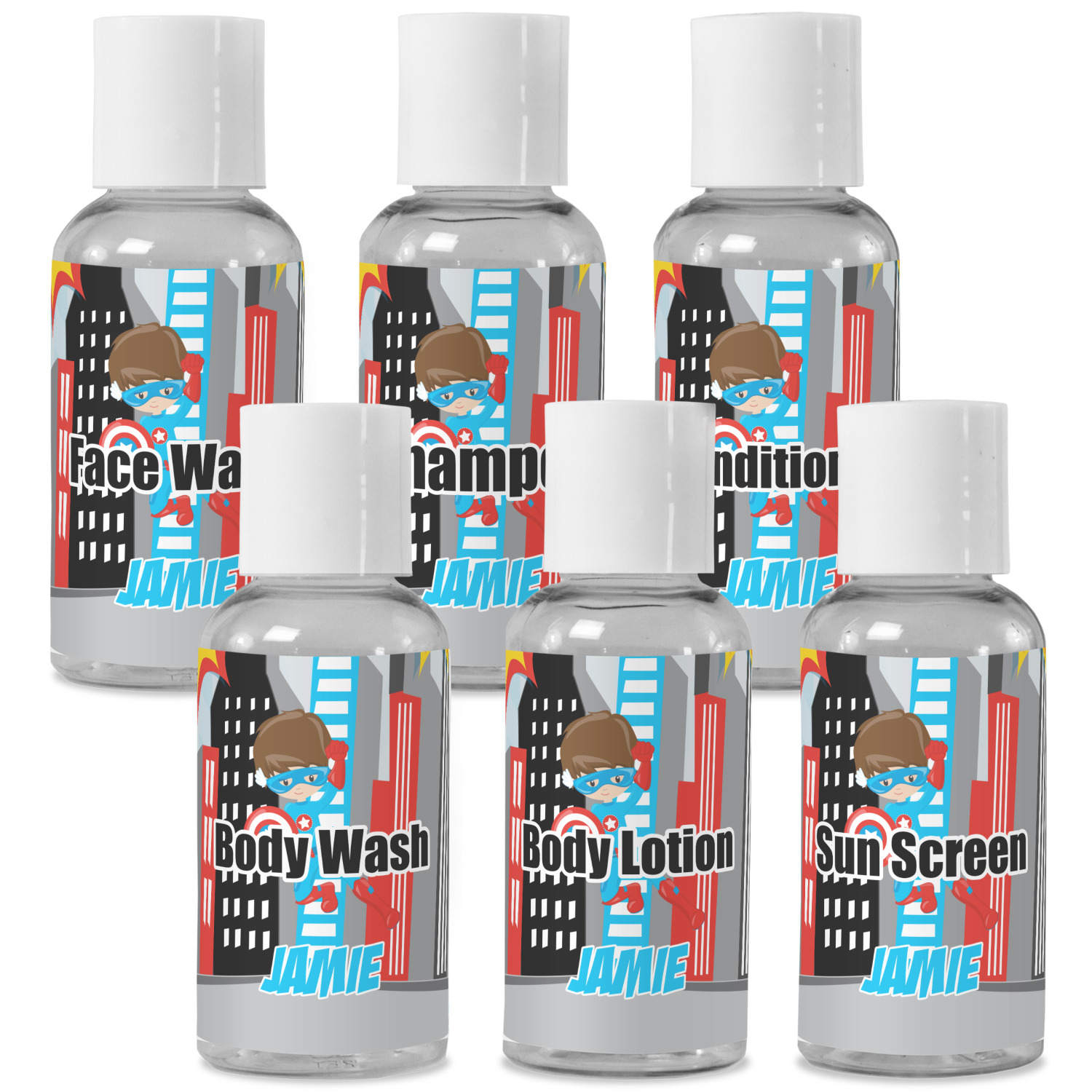 These soap and lotion travel bottles are the perfect place to start. Each set comes with 6 clear plastic bottles with white pop top lids. The bottles are cylindrical and can hold approximately 2.7oz. Perfect for plane travel!