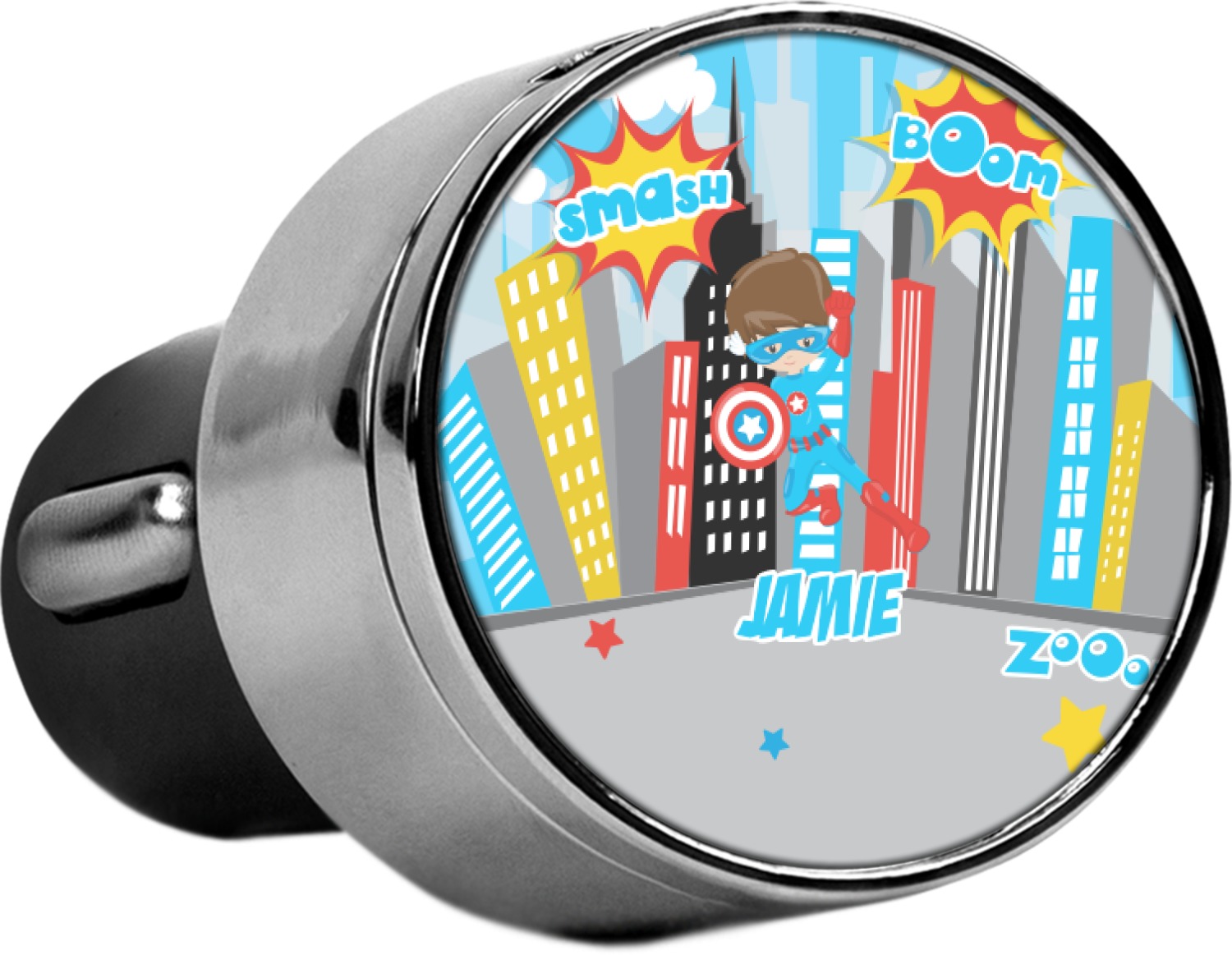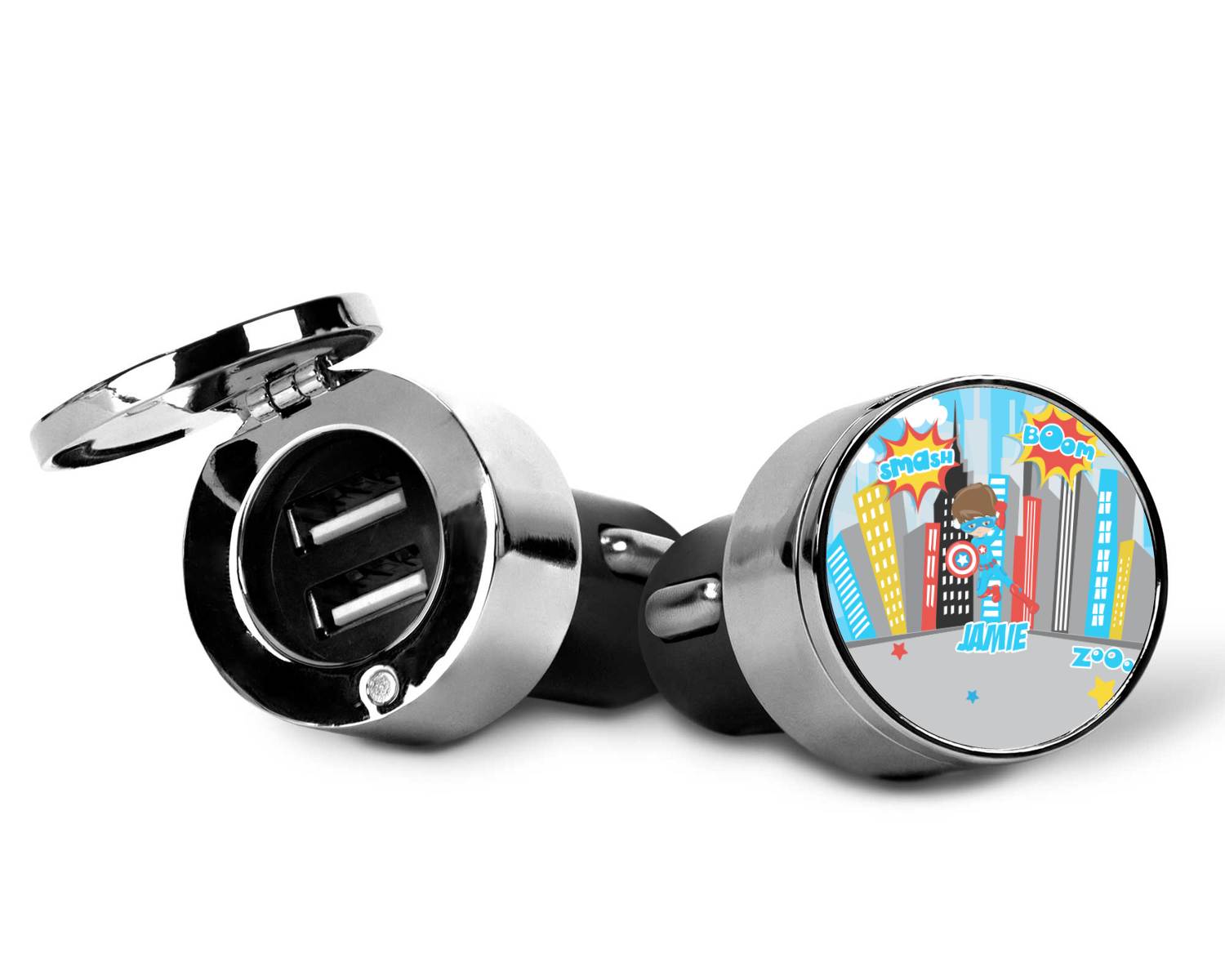 This car charger adapter converts your cars bland cigarette lighter into a decorative, personalized, and operational USB charging port. Made of solid, silver-plated metal, these chargers feature a flip-open lid that both displays your customized design and conceals two USB ports. The metal lid of the USB car charger adapter is 1.5" in diameter and seals due to a small, ingrained magnet on both the charger and its lid. The cigarette lighter insert, itself, is colored black.